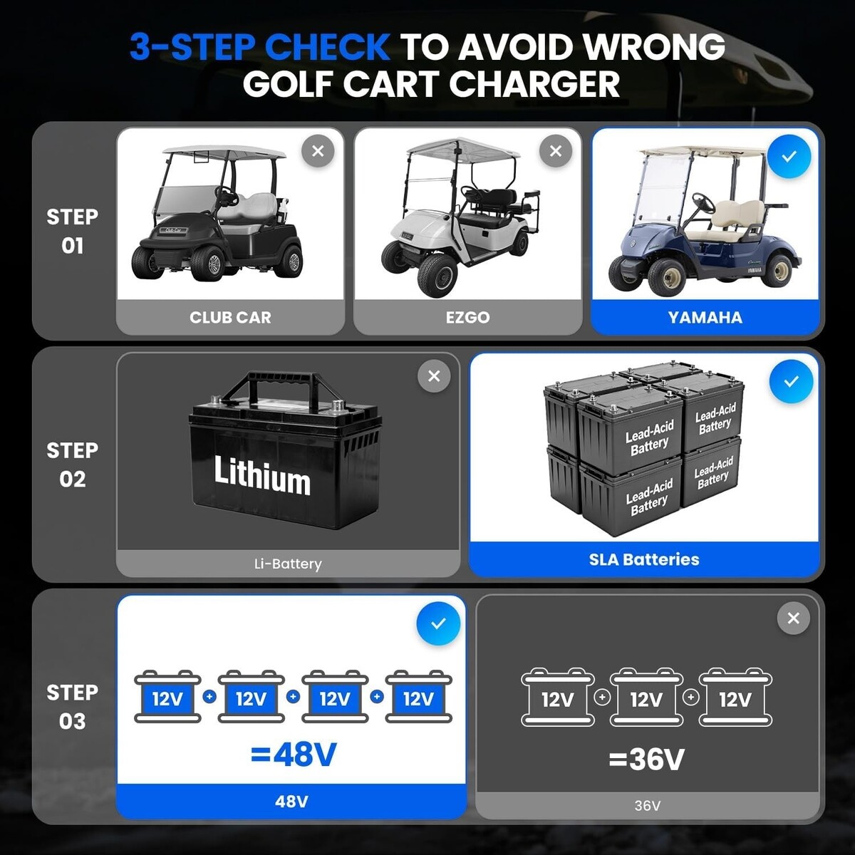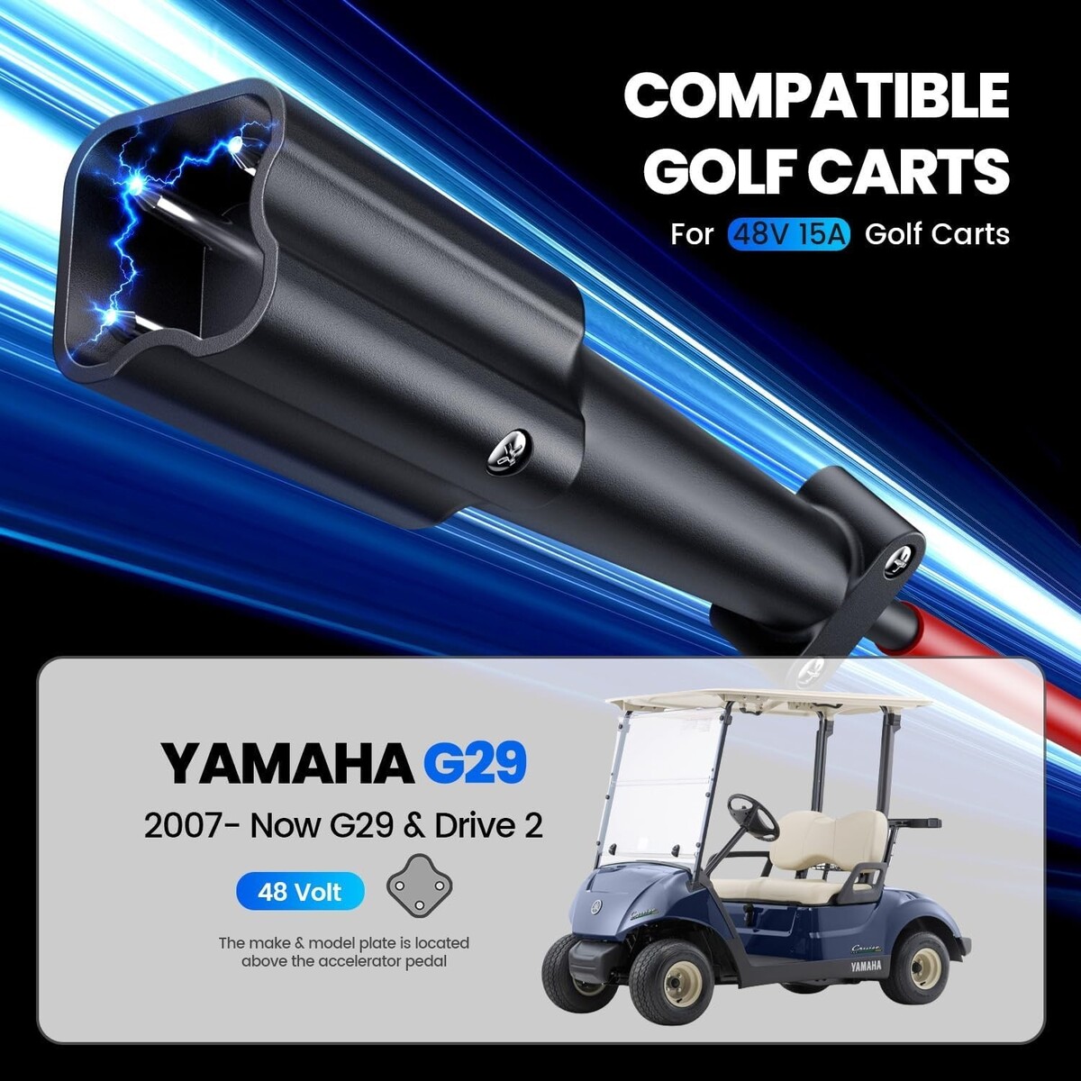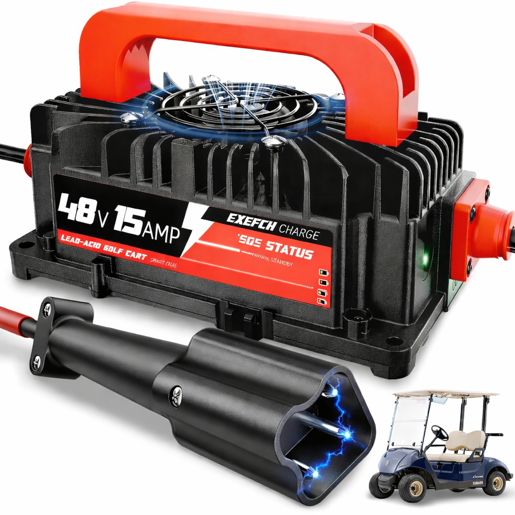 Fast charging and wide compatibility: Specifically designed for 48-volt Yamaha G29 Drive Drive 2 golf carts, 48v battery charger golf cart is equipped with a 3-pin blade plug for plug-and-play convenience, with charging speed increased by up to 60% than lead-acid battery