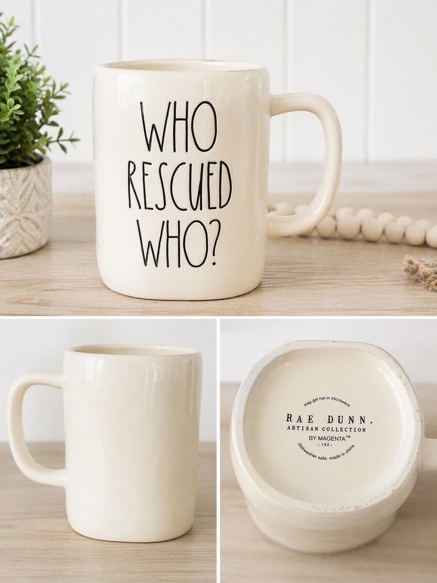 Rae Dunn ceramic mug featuring the popular ?WHO RESCUED WHO?? phrase in signature black lettering on a soft cream background. A perfect gift for animal lovers, rescue advocates, or Rae Dunn collectors. Classic farmhouse style that fits any kitchen or coffee bar.