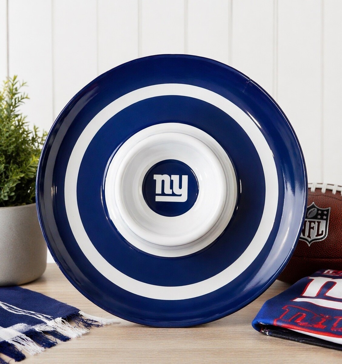 Official NFL New York Giants chip and dip serving bowl featuring bold blue and white concentric ring design with center NY logo. This 2-piece style platter has a built-in dip well, making it perfect for game day entertaining, parties, or fan collections. A great display piece as well.
