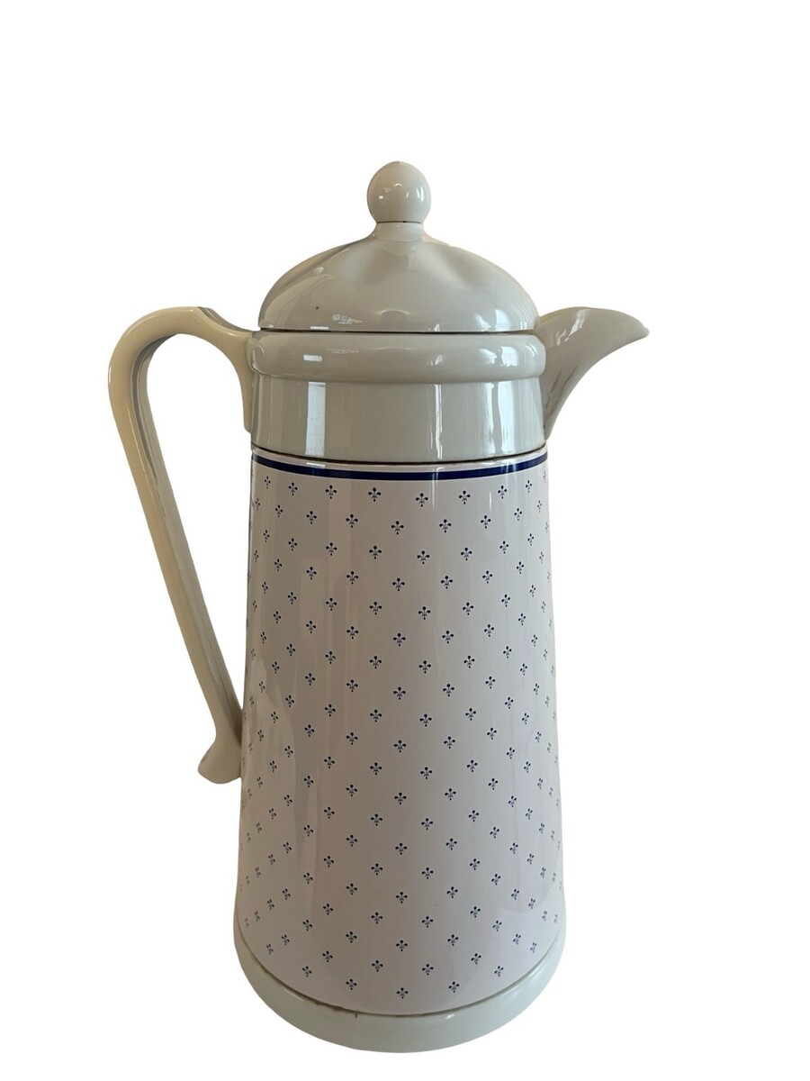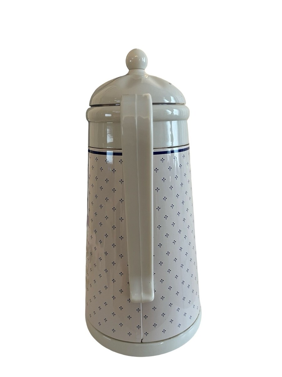 Vintage King brand insulated thermos carafe featuring a classic white body with blue fleur-de-lis pattern and blue band detail. This tall server includes its original lid and glass-lined interior, designed to keep beverages hot or cold. Marked ?King? on the bottom and made in Taiwan. A great piece for farmhouse, cottage, or vintage kitchen decor, as well as functional use.