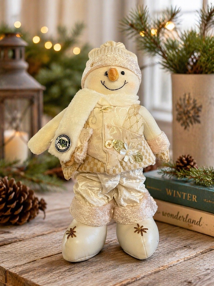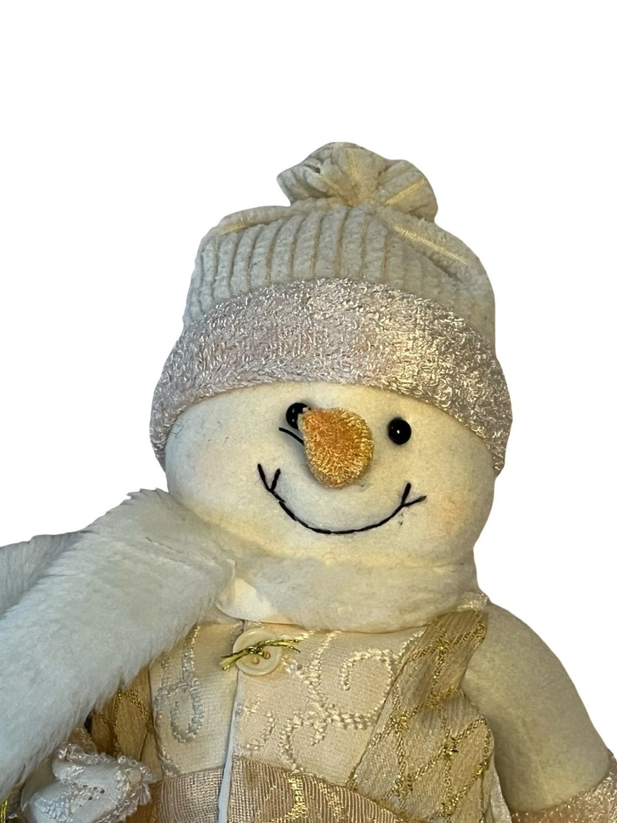 Charming winter snowman plush from the American Payroll Association (APA), featuring a soft cream and gold color palette with elegant seasonal detailing. This piece has a cozy, vintage-inspired look with textured fabrics, embroidered accents, and a warm neutral tone that fits beautifully into holiday or winter decor displays. The sand-weighted feet help it stand securely, making it ideal for shelf, tabletop, or mantel styling. A unique collectible tied to the APA, making it a fun conversation piece as well.