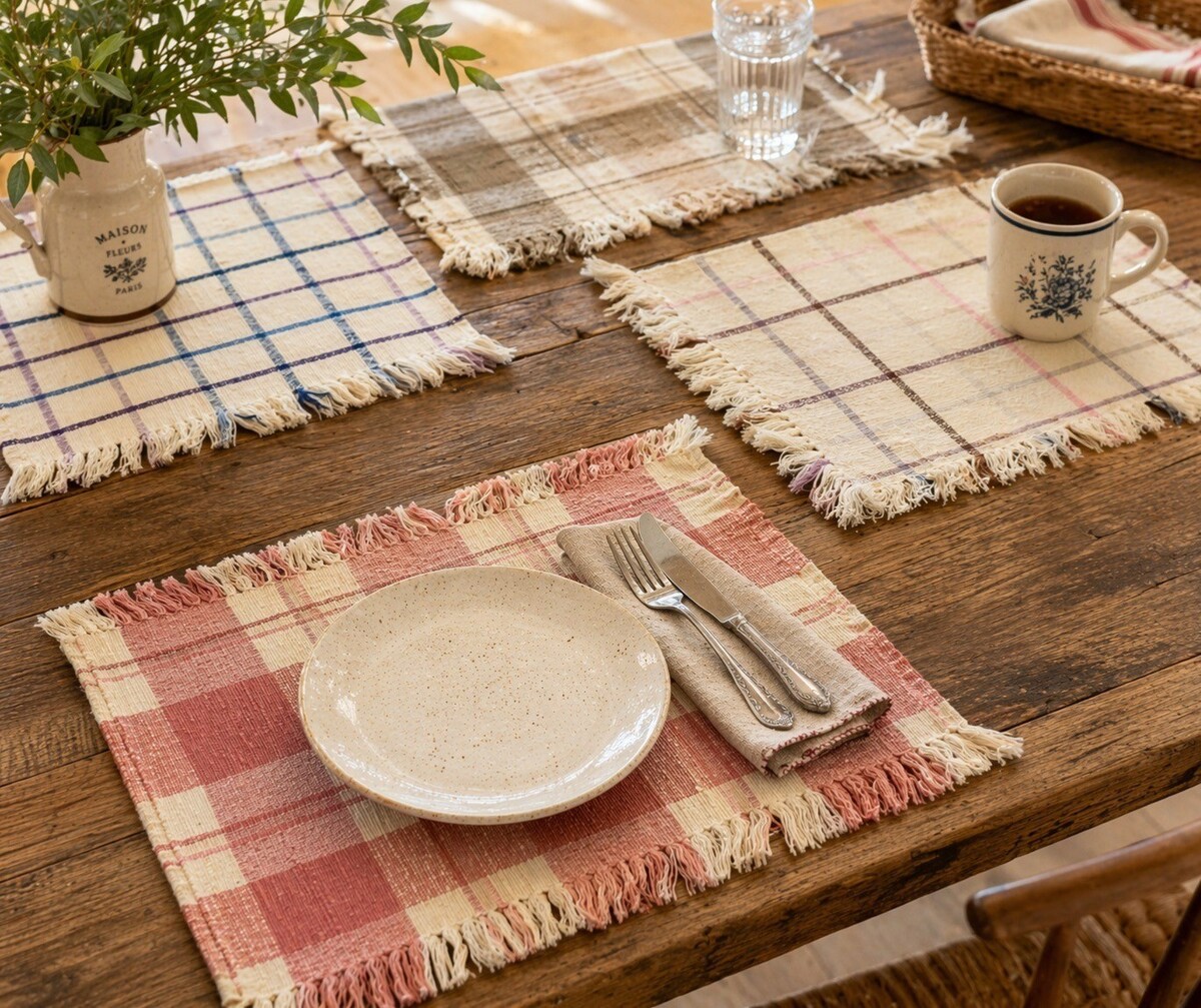 Set of four vintage woven placemats featuring classic plaid patterns with fringe edges. These pieces reflect a popular late 20th-century farmhouse and country kitchen style, with soft muted tones and textured weaving.