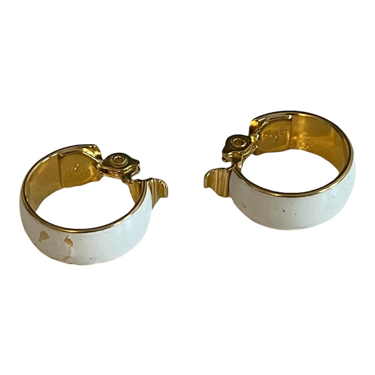 Monet Clip On Earrings Gold Tone White Enamel Hoop Signed Vintage 80s 90s