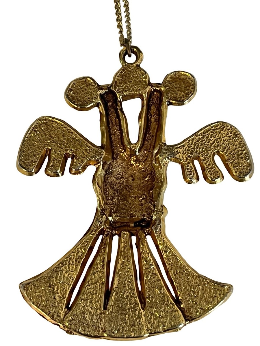 Vintage statement pendant necklace featuring a striking abstract double bird or twin-headed figure design in textured gold-tone metal. The sculptural form has a strong Brutalist and mid-century modern influence, with stylized wings and a flared base that gives it a bold, artistic presence.