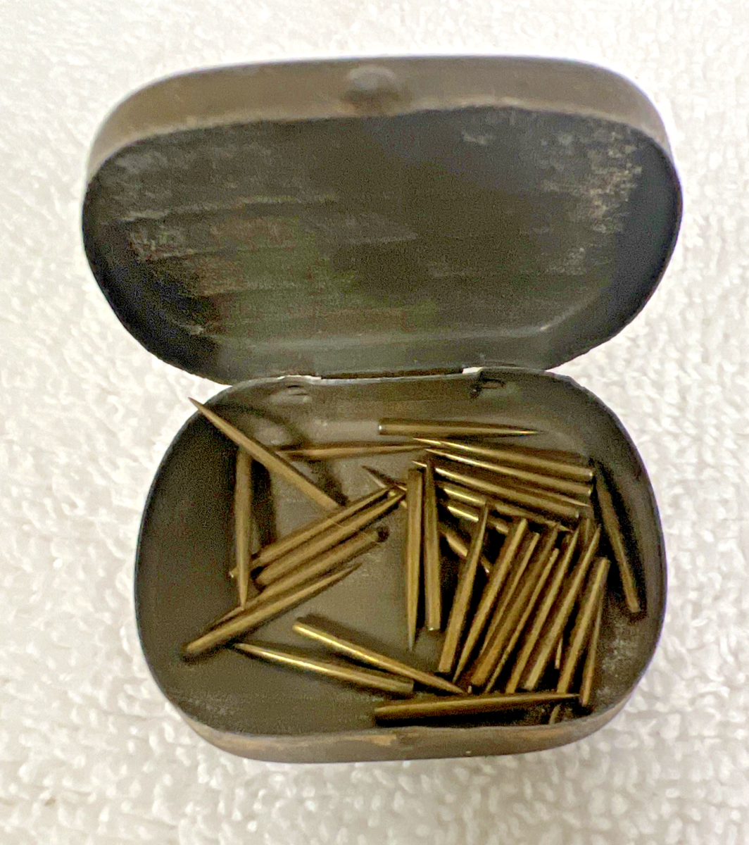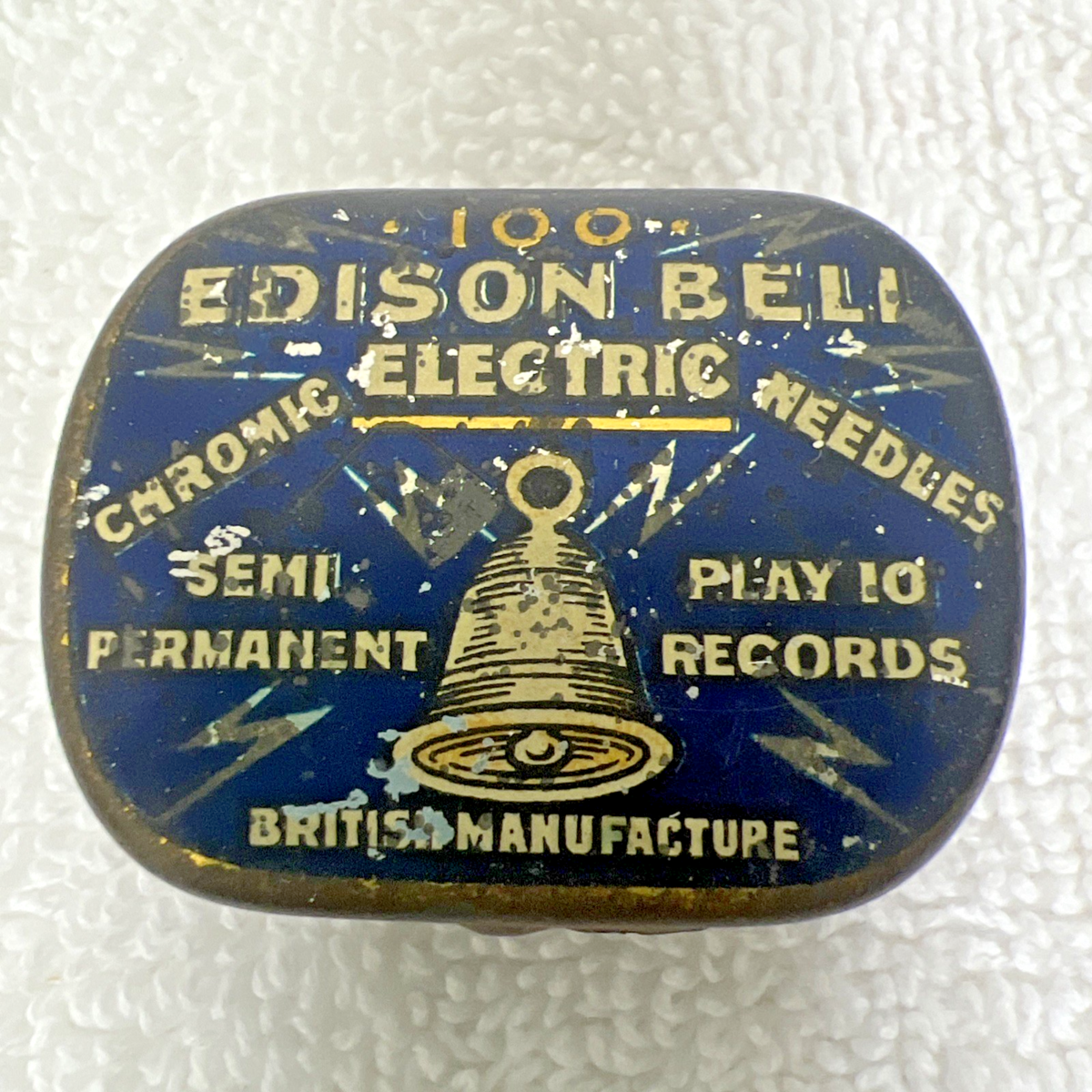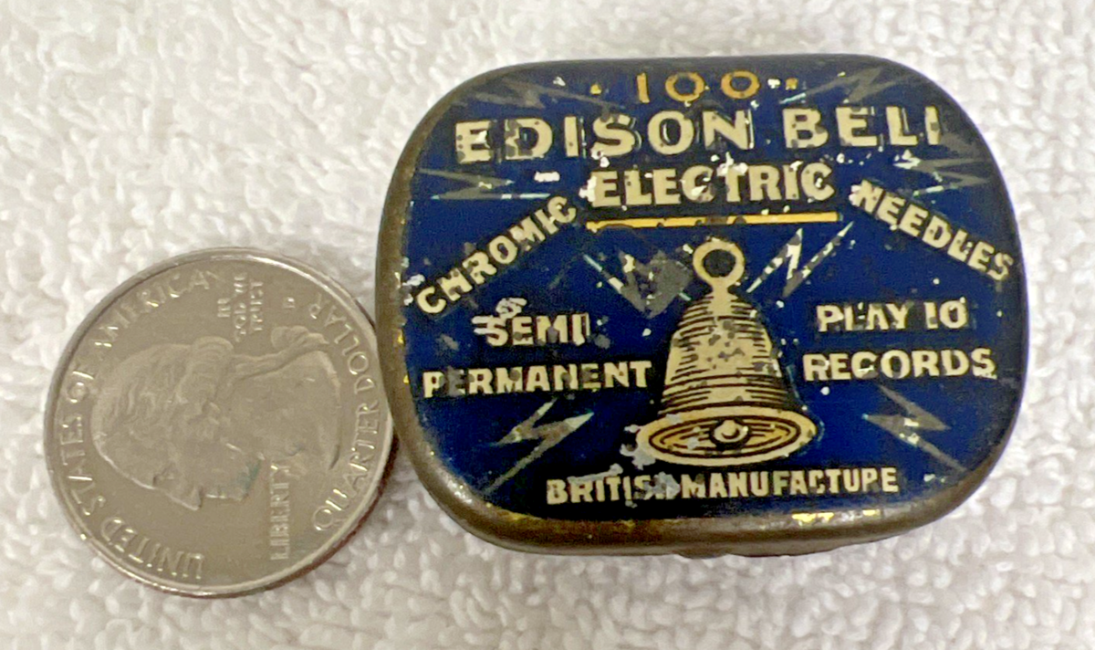 Vintage 100 Edison Bell Semi Permanent Chromic Electric Needles Blue Tin. Good used condition, measures 1 1/2" x 1 1/4", surface scratching, some needles present. See pictures.