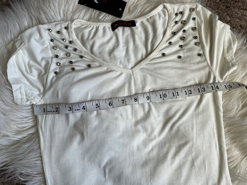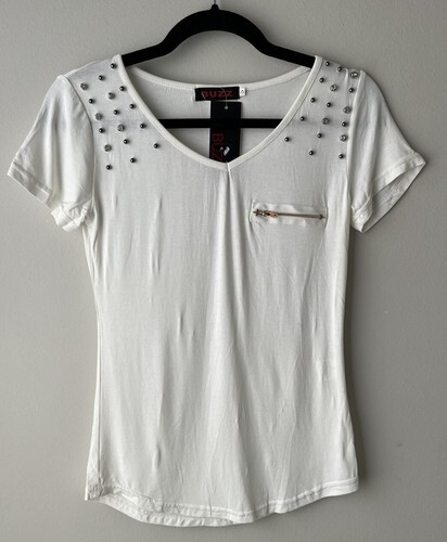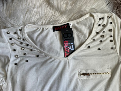 Buzz Girl Plain Blouse Metal Studded Regular Short Sleeve White Size Small. Condition is New with tags. Shipped with USPS Ground Advantage.