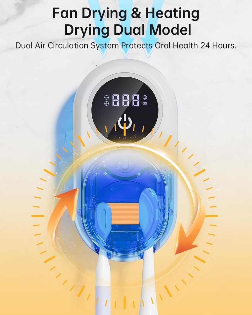 Dual Cleaning Cycle Heating Drying Mode: The innovative toothbrush sanitizer combines UV-C light with a gentle air/warm heat drying system. This dual-action process not only sanitizes but also efficiently dries your toothbrushes, ensuring they remain clean all day.