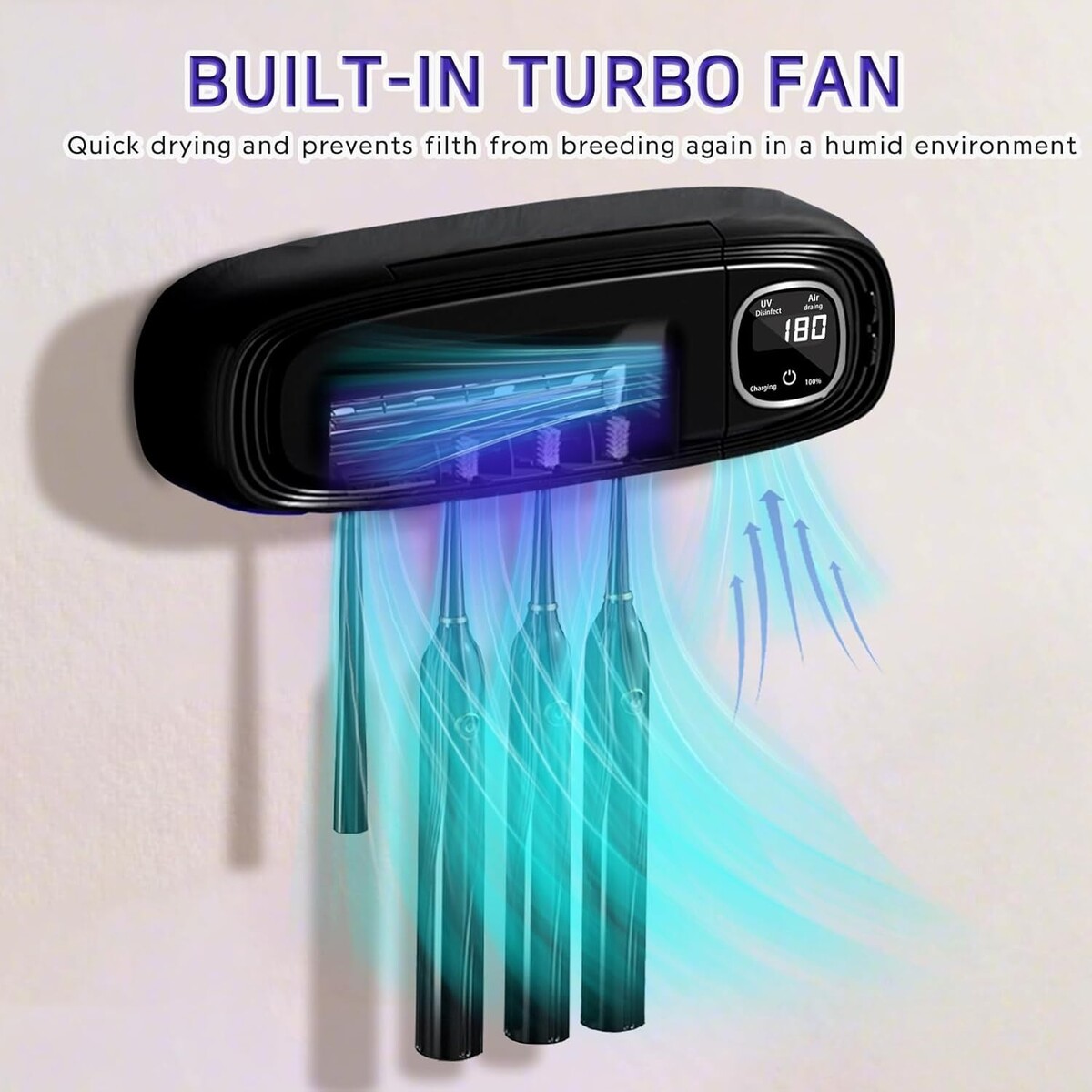 Powerful Cleaning + Air Drying Combo: Our wall-mounted toothbrush holder zaps 99% of germs from your toothbrushes while a built-in turbo fan dries them swiftly. Enjoy peace of mind with cleanliness like never before.