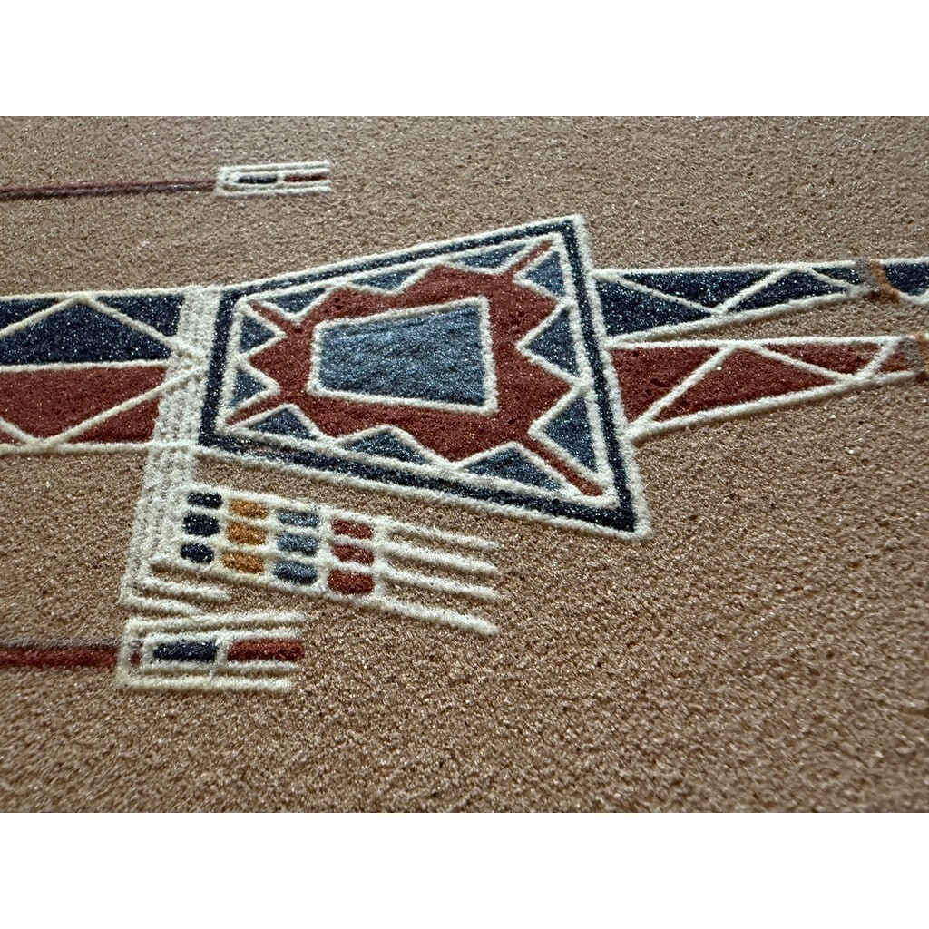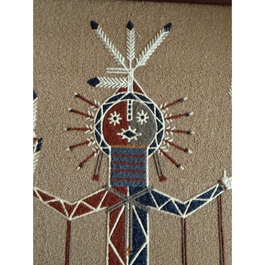 A beautiful, collectible work of Navajo sand art?highly suitable for Southwestern, mid-century, boho, adobe, lodge, or gallery interiors.