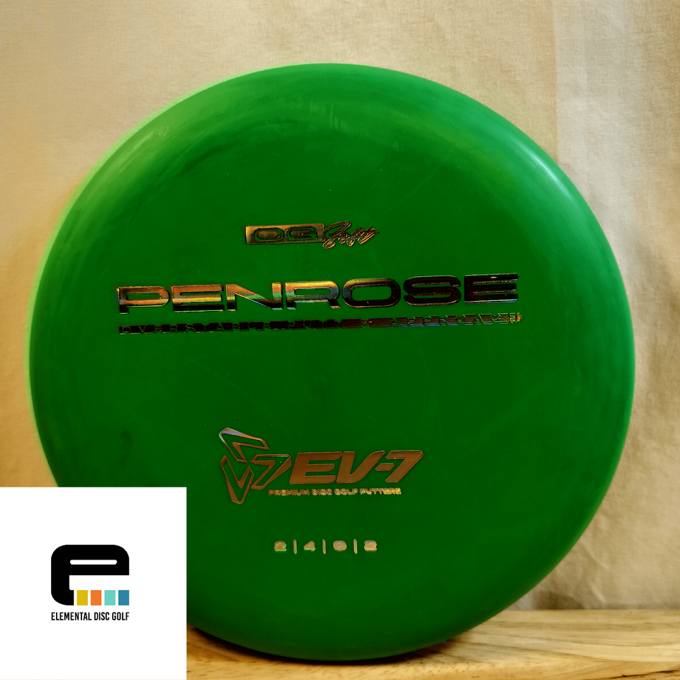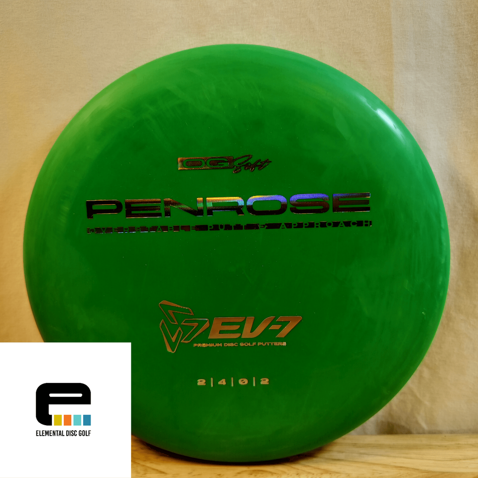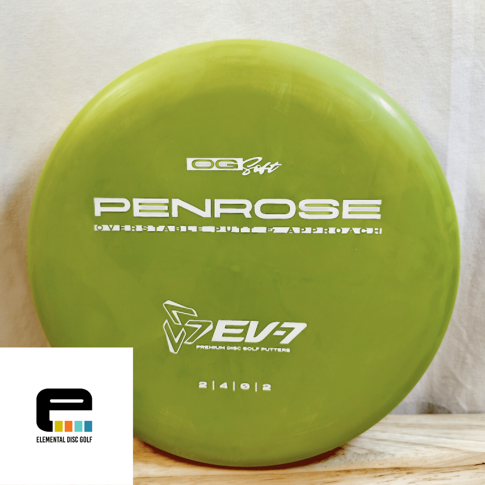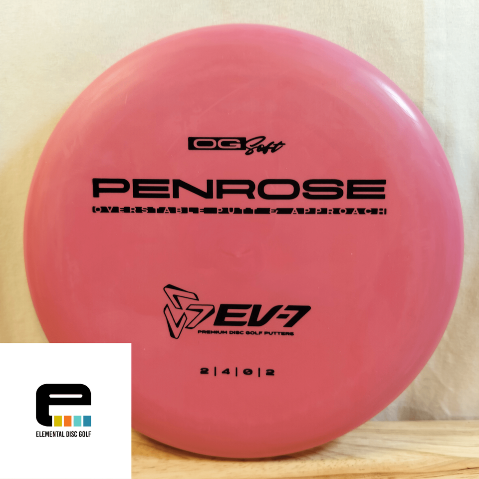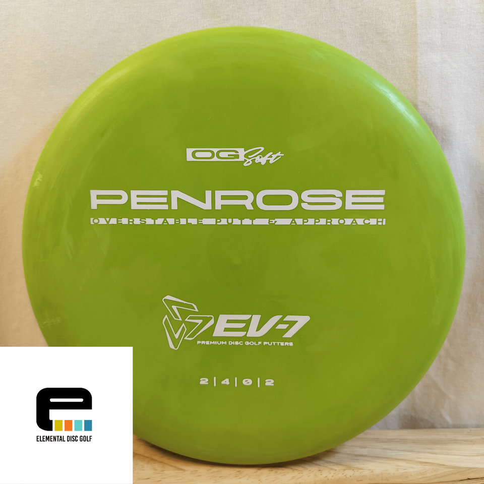 EV-7 OG Soft Penrose (2/4/0/2)The EV-7 OG Soft Penrose is a stable-to-overstable putter designed to give players a consistent, confidence-inspiring flight for both putting and approach shots. With flight numbers of 2 / 4 / 0 / 2, the Penrose offers a straight flight with minimal turn and a reliable fade, making it ideal for players who need a putter that stays on line and finishes strong.Crafted in OG Soft plastic, this disc provides a tacky, flexible feel that enhances grip and comfort in the hand. The added softness allows the Penrose to grab chains effectively on putts and stick to the ground on approaches, reducing unwanted rollaways. OG Soft plastic also seasons gradually, giving players a trusted, consistent flight over time.Perfect for players of all skill levels, the Penrose excels at spin putts, push putts, and controlled approach throws, even in slightly windy conditions. Its blend of glide, stability, and grip makes it a versatile workhorse for the short game.