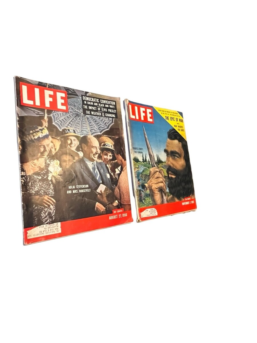 Vintage lot of two original LIFE magazines from 1955 and 1956, loaded with iconic mid-century advertising and cultural content. This set includes the ?Epic of Man? era issue and a 1956 issue featuring Elvis Presley content, along with standout full-page ads and photo spreads.