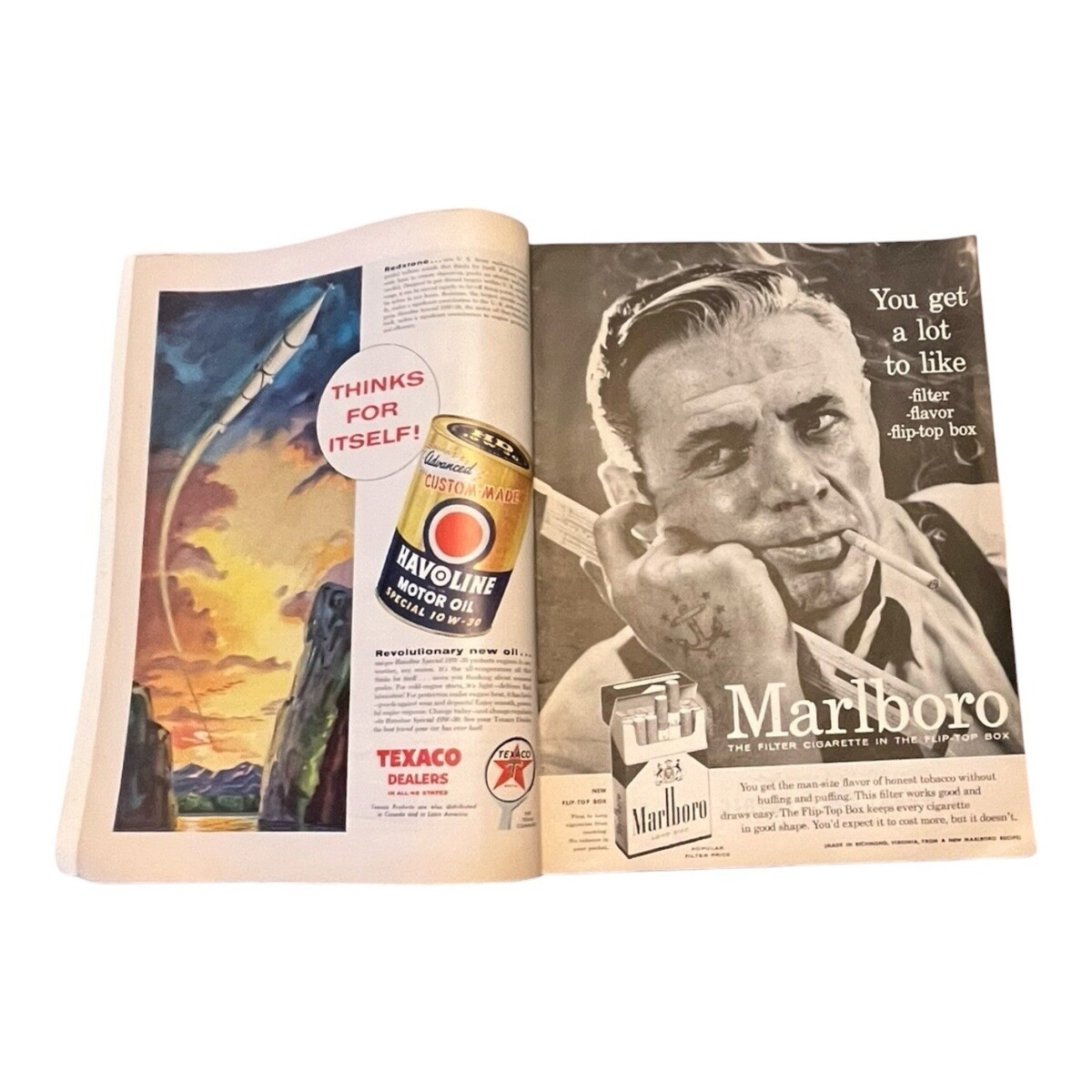 Full-page vintage ads (Marlboro, Coca-Cola, Lucky Strike, Texaco, Calvert, Pepto-Bismol)