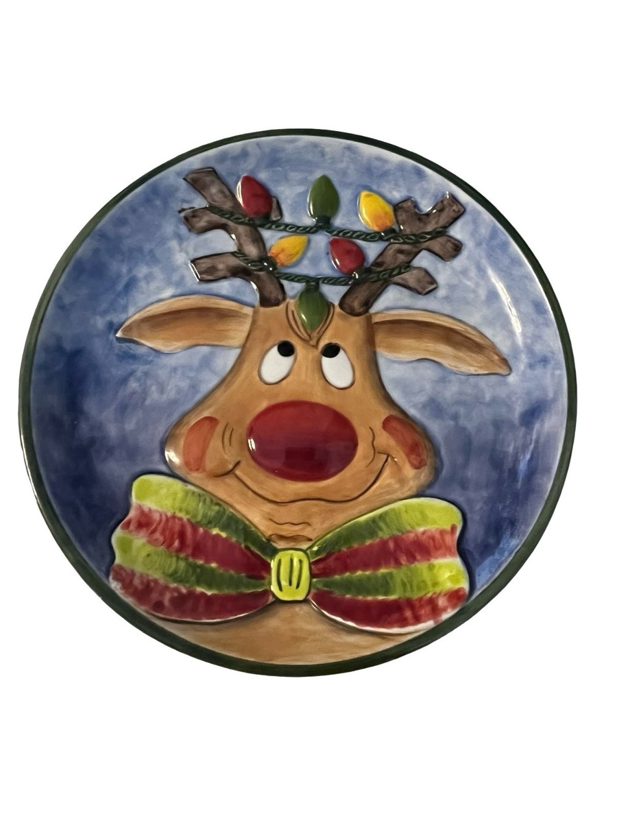 Charming Clay Art holiday plate featuring a hand painted reindeer with colorful Christmas lights and a festive bow. This whimsical design has a raised, dimensional look that adds character and makes it perfect for holiday decorating or serving seasonal treats. A fun and collectible piece from Clay Art?s early 2000s holiday line.