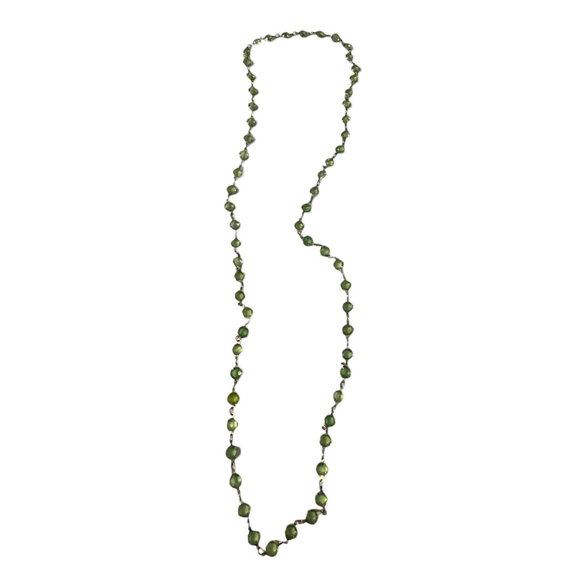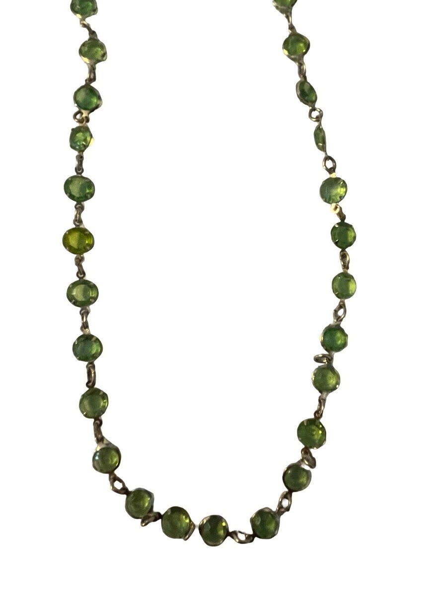 Vintage green glass bead necklace featuring unique flat faceted beads that are smooth on the front and back with softly beveled edges. The translucent green tones range from olive to peridot shades, catching the light beautifully. Each bead is individually linked with silver tone connectors in a classic station-style design. Lightweight and easy to wear, this piece has a clean, slightly earthy vintage look that works well layered or worn alone.