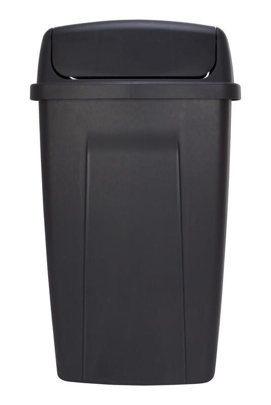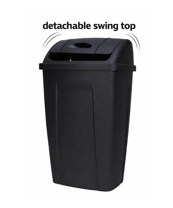Mainstays Kitchen Trash Can, 13 Gallon Plastic Garbage Bin with Swing Top Lid, Black Durable Plastic Construction: Sturdy plastic design resists everyday wear while remaining lightweight and easy to move Easy-to-Clean Surface: Smooth finish wipes down quickly, helping maintain a fresh appearance with minimal effort Dual Swing Lid Design: Lid swings inward when pushed or lifts up for quick access, making trash disposal simple and hygienic Standard 13 Gallon Capacity: Accommodates widely used 13-gallon kitchen trash bags, reducing the need for frequent emptying Space-Saving Shape: Designed to fit conveniently in kitchens, bathrooms, garages, or offices without taking up excess floor space Modern Black Finish: Versatile black color complements a variety of decor styles while keeping a sleek, understated look
