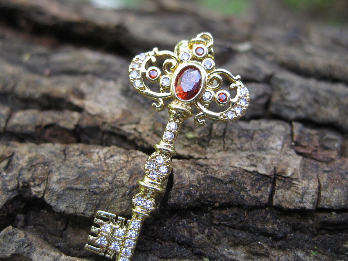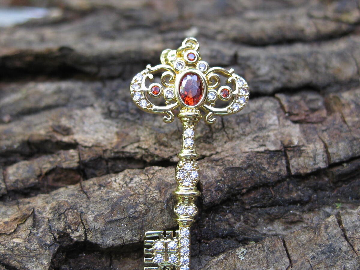 Vessel: Beautiful intricate golden key with a vibrant ruby stone at the top. This key comes with a recharging chain.