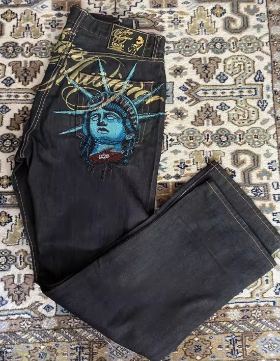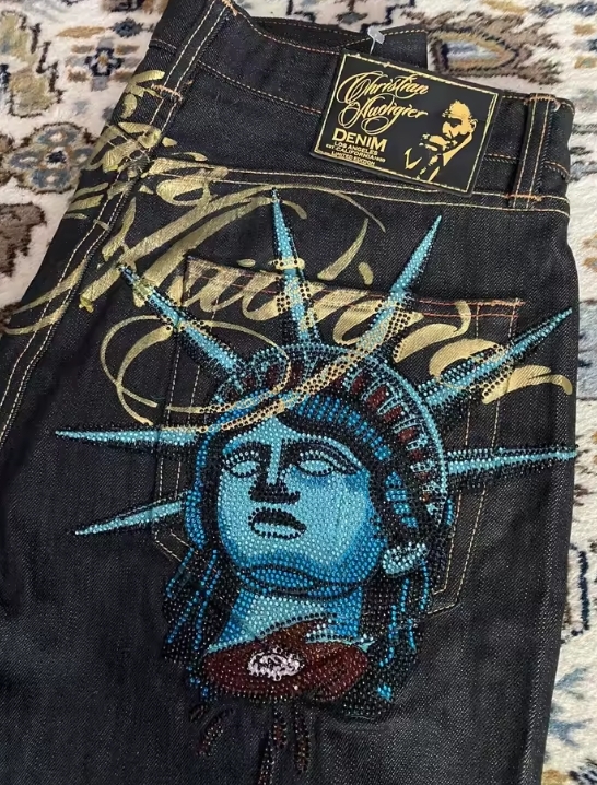Step into bold retro style with these Y2K Harajuku-inspired wide leg jeans ? Designed for trendsetters who love standing out, these high-waist denim pants feature a unique Statue of Liberty graphic with subtle diamond detailing for that perfect vintage streetwear vibe.