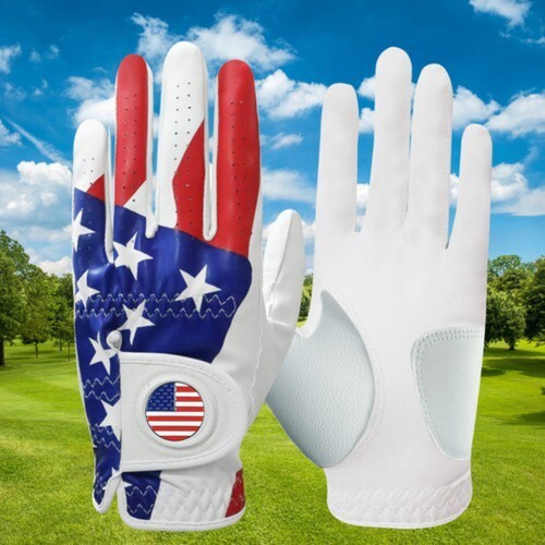 A SUPERB QUALITY GOLF GLOVE WITH A STRONG MAGNET ON THE CLOSURE FLAP WHICH WILL TAKE ANY FLAT GOLF BALL MARKER.