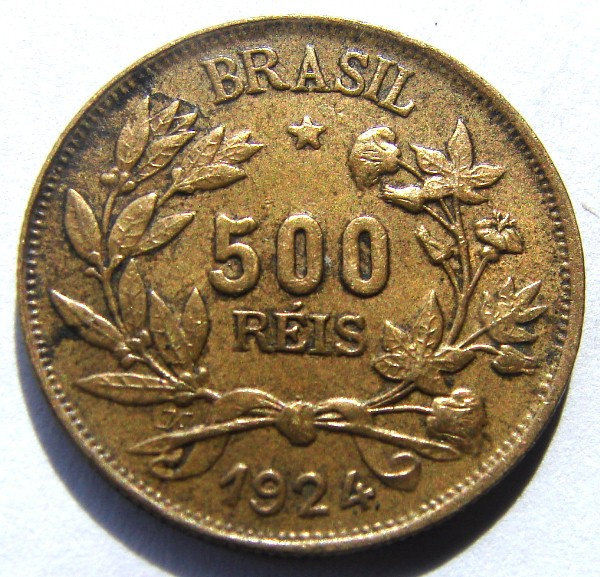 REVERSE: Denomination within wreath. Date below. Lettering: BRASIL 500 RÉIS 1924.