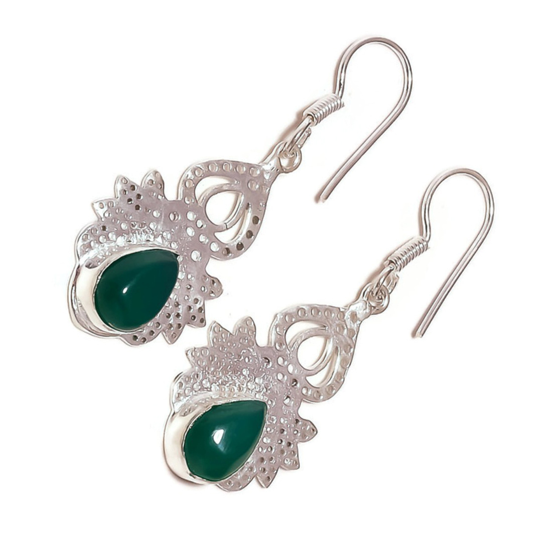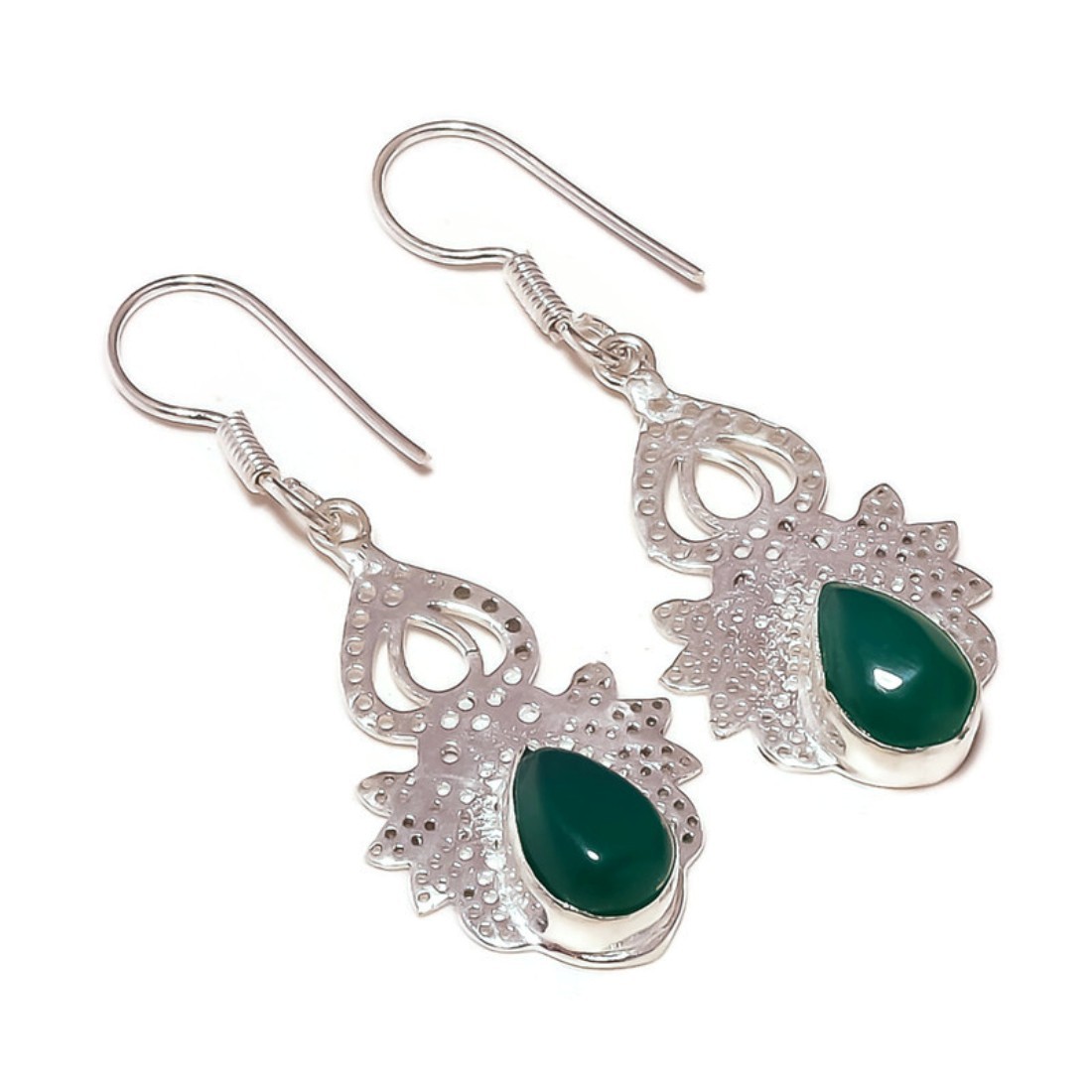 Cabochon Green Onyx Gemstone 925 Silver Overlay Handmade Dangle Filigree Earring