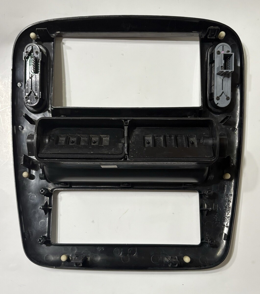 OEM Ford dash radio bezel removed from a 2002-2005 Ford Explorer (compatible with Mercury Mountaineer as well). This is the full center trim with the wood-grain finish, integrated A/C vents, and the factory information and 4x4 mode switches still attached. No cracks. Great upgrade or replacement for peeling, faded, or broken trim.