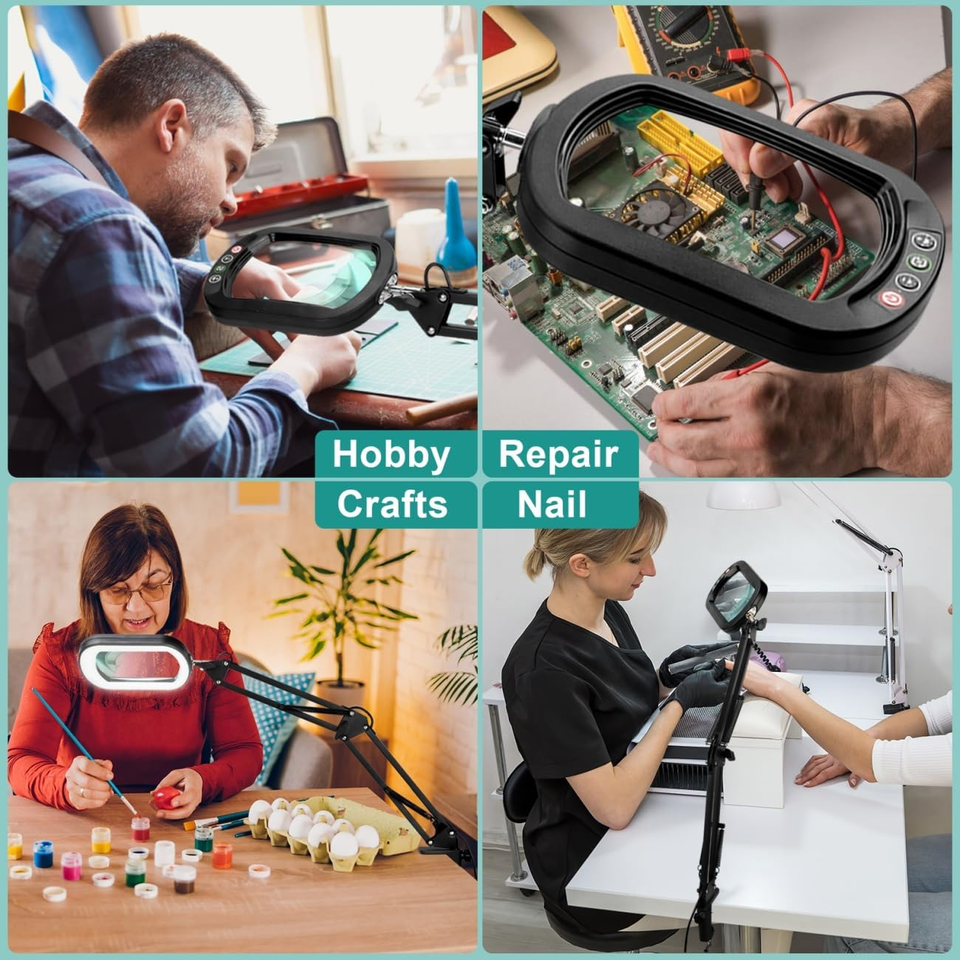 - 0X Rectangle Magnifying Glass Lamp • 5 Color Modes, Dimmable LED Clamp Swing Arm