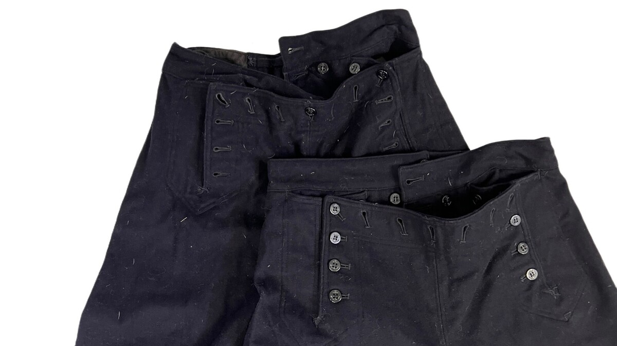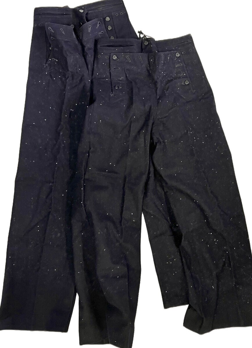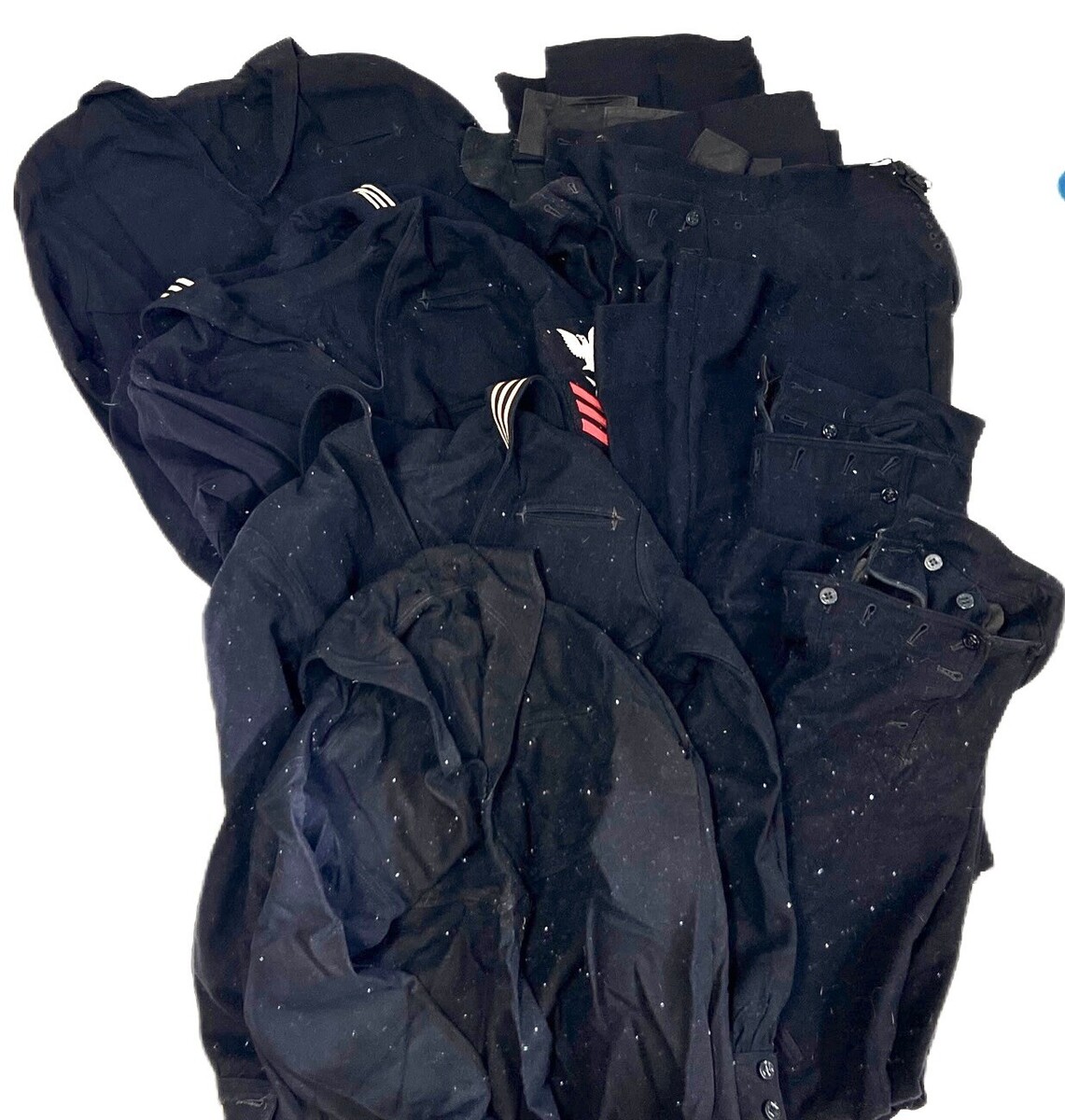 Vtg US Navy Uniforms WW2 10 PC DRESS Blues + Duffle All size 40R Shirts are in good used condition, stored in the included duffle bag. Includes 5 tops, 4 sailor bottoms with loads of buttons. The spots are from dust in sunlight, not on the items. They are dark and in great but stored condition.