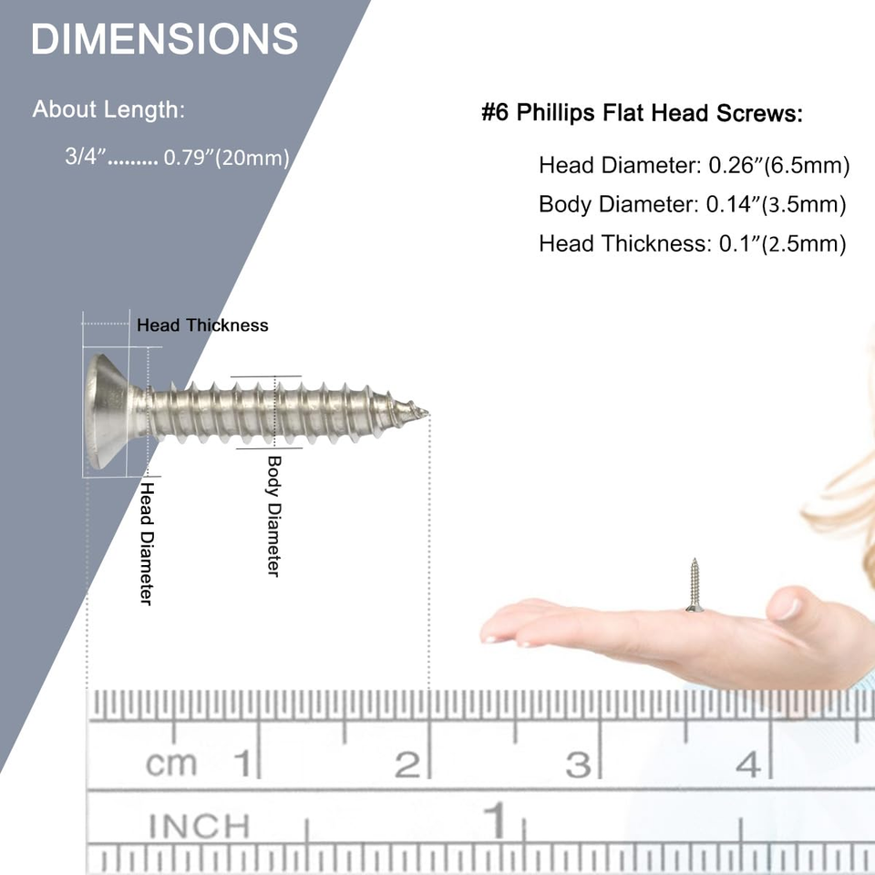 PREMIUM QUALITY: Crafted from high-grade 304 stainless steel, our 120PCS Flat Head Phillips Wood Screws are designed for exceptional durability and resistance to corrosion and rust. These screws are perfect for a variety of woodworking projects, particularly when working with softer woods. For optimal results in harder wood, it is advisable to pre-drill a pilot hole. Please note that these screws are not suitable for use with very hard materials such as metal or walls, and should not be used with high-speed drills.