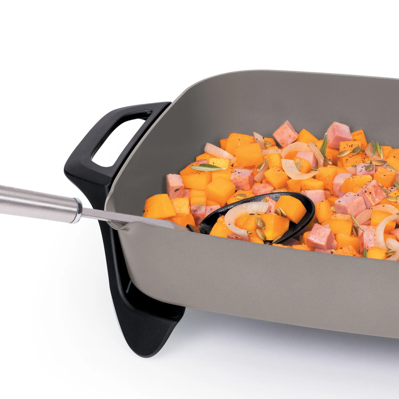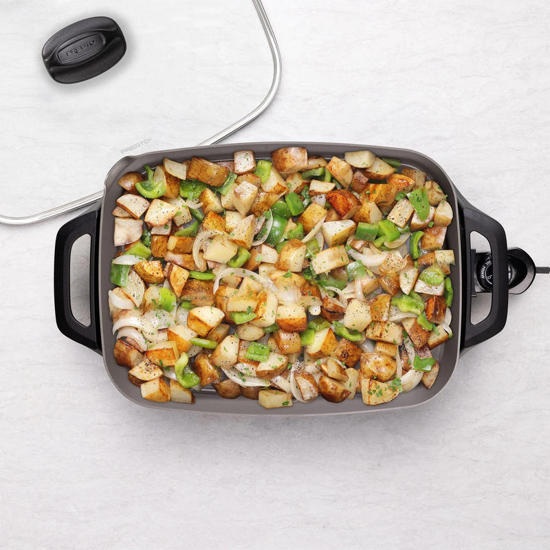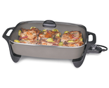 The Presto 16" Ceramic Electric Skillet with Glass Cover, Silver 06860 will roast, fry, grill, stew, bake, and make casseroles. The ceramic nonstick surface, inside and out, offers stick-free cooking. With a 16-inch base, high sidewalls, and a tempered glass cover, you?ll find this Presto skillet perfectly sized for making breakfast, lunch, and dinner, and it can easily serve as a buffet server using the pour spout as a spoon or spatula holder. Cooking temperatures are maintained automatically with the Control Master heat control and with the heat control removed, the skillet is fully immersible for easy cleaning.