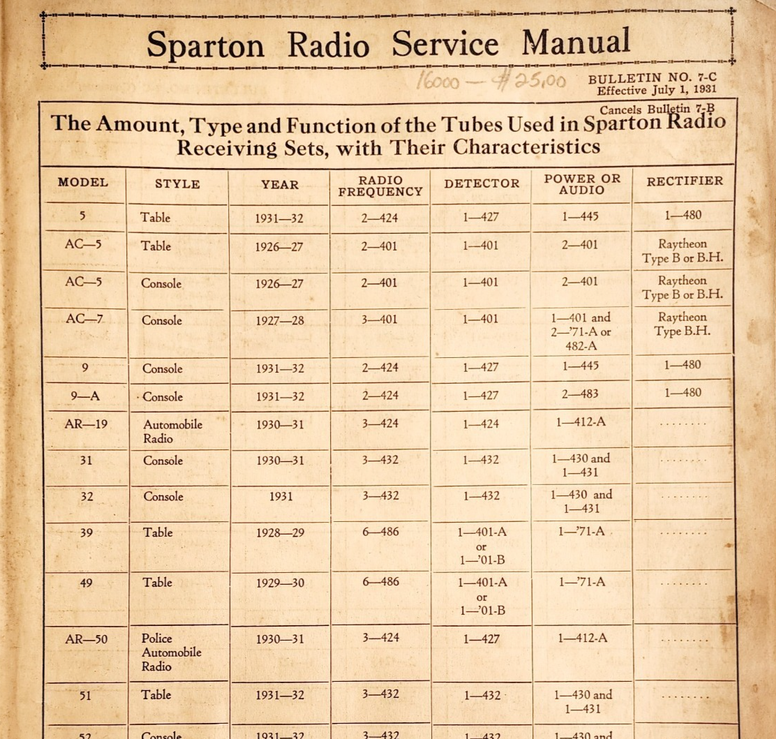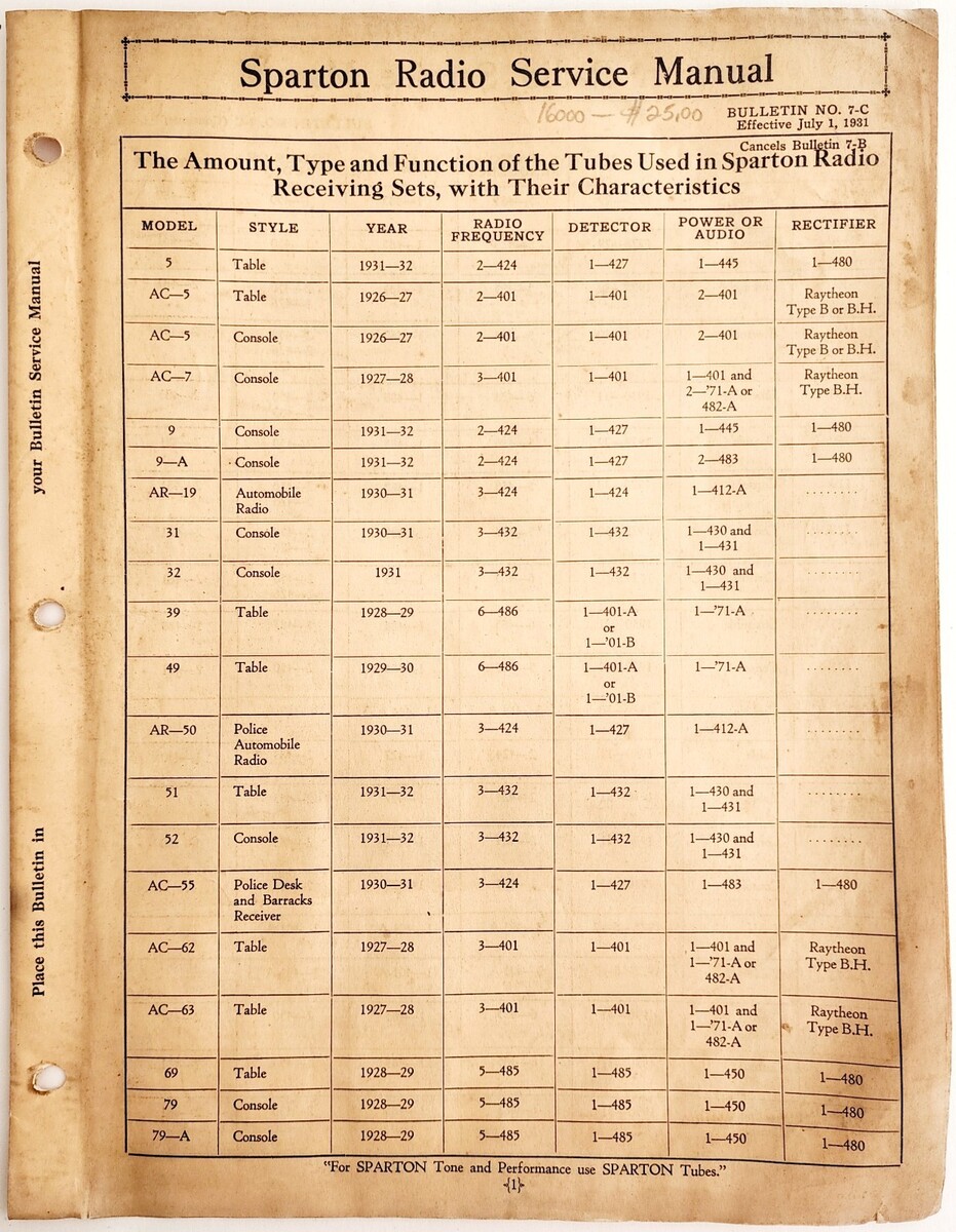 1931 Sparton Radio Service Manual Tubes Parts List Tri-Fold Bulletin F20C