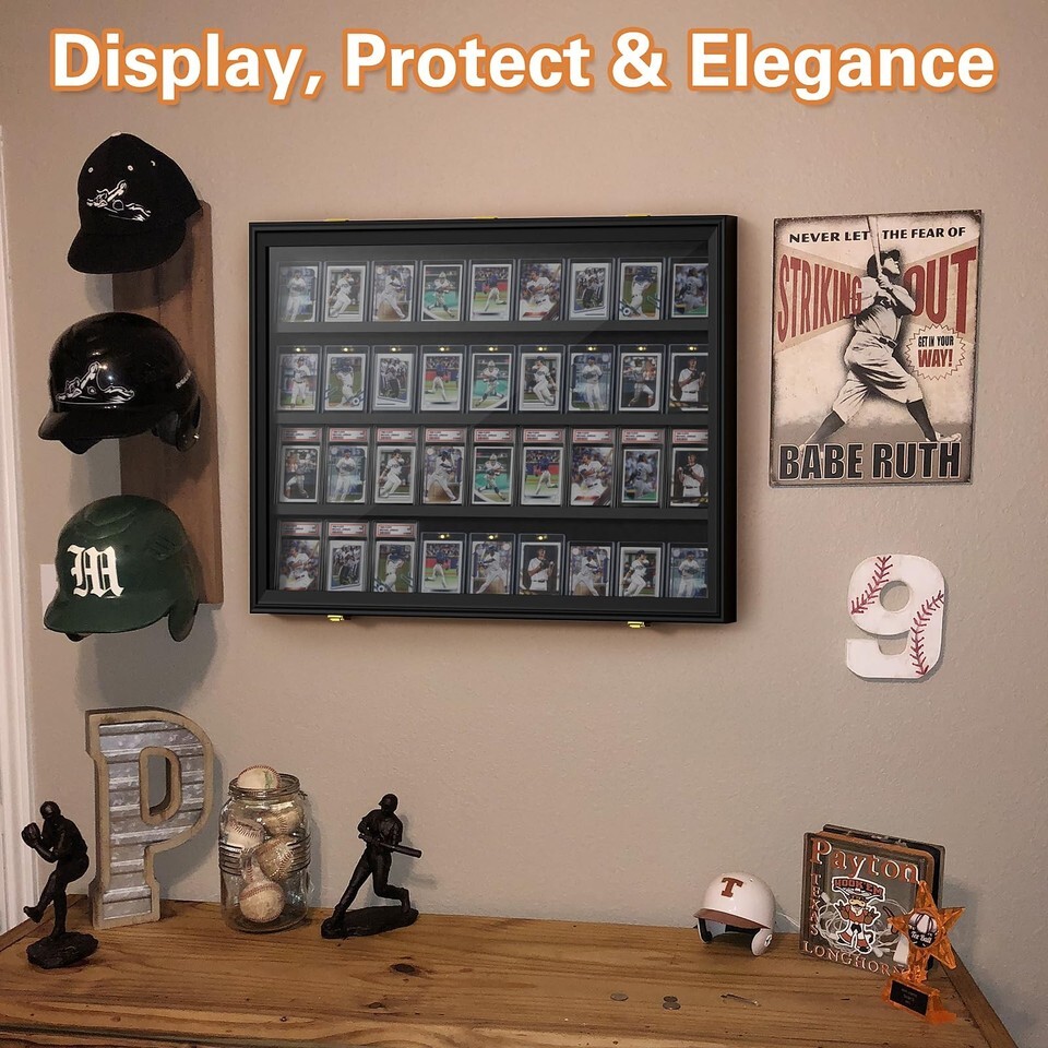 2 Pack Graded Trading Card Display Case Baseball Sports 36 PSA Slab Wood Frame - Total capacity of 72 graded cards in both frames Showcase this display case in any room of your home?it?s designed to look great anywhere! Finding the right display case for your graded trading cards can be challenging, but this black case is the ultimate solution. With its black matted background, it provides an attractive way to showcase your collection of graded sports and trading cards, creating a display you?ll be proud of. Features: Wood in Black FINISH (Cards shown not included). Dimensions: 31.1" W x 24.4" H x 2.16" D, an interior depth of 1.18", and a single-layer height of 5.6? Perfect Gift for Collectors: Elegant wooden card display case with matte black finish and velvet background?an ideal gift for baseball, football, hockey, Pokemon, and TCG fans. 2-Pack Large Capacity Design: Each frame holds 36 graded cards, giving you space for a total of 72 cards across both cases?perfect for serious collectors. Generous Dimensions: External size 31.1" W 24.4" H 2.16" D, interior depth 1.18", single-layer height 5.6". Designed to fit graded cards up to 5.6" tall. Crystal-Clear Acrylic with UV Protection: Premium acrylic panel provides 92% transparency and 98% UV protection, preventing fading, yellowing, and light damage while displaying cards clearly. Solid Wood Frame with Anti-Slip Shelves: Built from durable wood for long-term use. Each shelf has non-slip edges to keep cards secure and properly aligned. Lockable for Security: Equipped with anti-theft locks for peace of mind, protecting your collection from accidental loss or unwanted handling. Stable Wall Mounting: Includes sturdy metal brackets and tooth hangers for reliable installation, ensuring your display stays safe and level on the wall. Protective Packaging: Wrapped in 360 foam with protective film on the acrylic panels?ensuring your display cases arrive scratch-free and in perfect condition. Shipping Return Policy We proudly offer FREE shipping on all orders within the lower 48 U.S. states. Please note that we do not offer combined shipping, local pickup, or delivery to P.O. boxes or APO/FPO addresses. Orders are processed within 1?3 business days. Most items arrive within 3?4 business days, though delivery may take up to 8 business days depending on the carrier. Any estimated arrival Customer satisfaction is very important to us, and we want you to have a great experience. If there are any issues with your order, please contact us directly before opening a case or requesting a return. This allows us to resolve the matter quickly and provide you with a return authorization if needed. We proudly offer 30-Day Free Returns for your convenience.