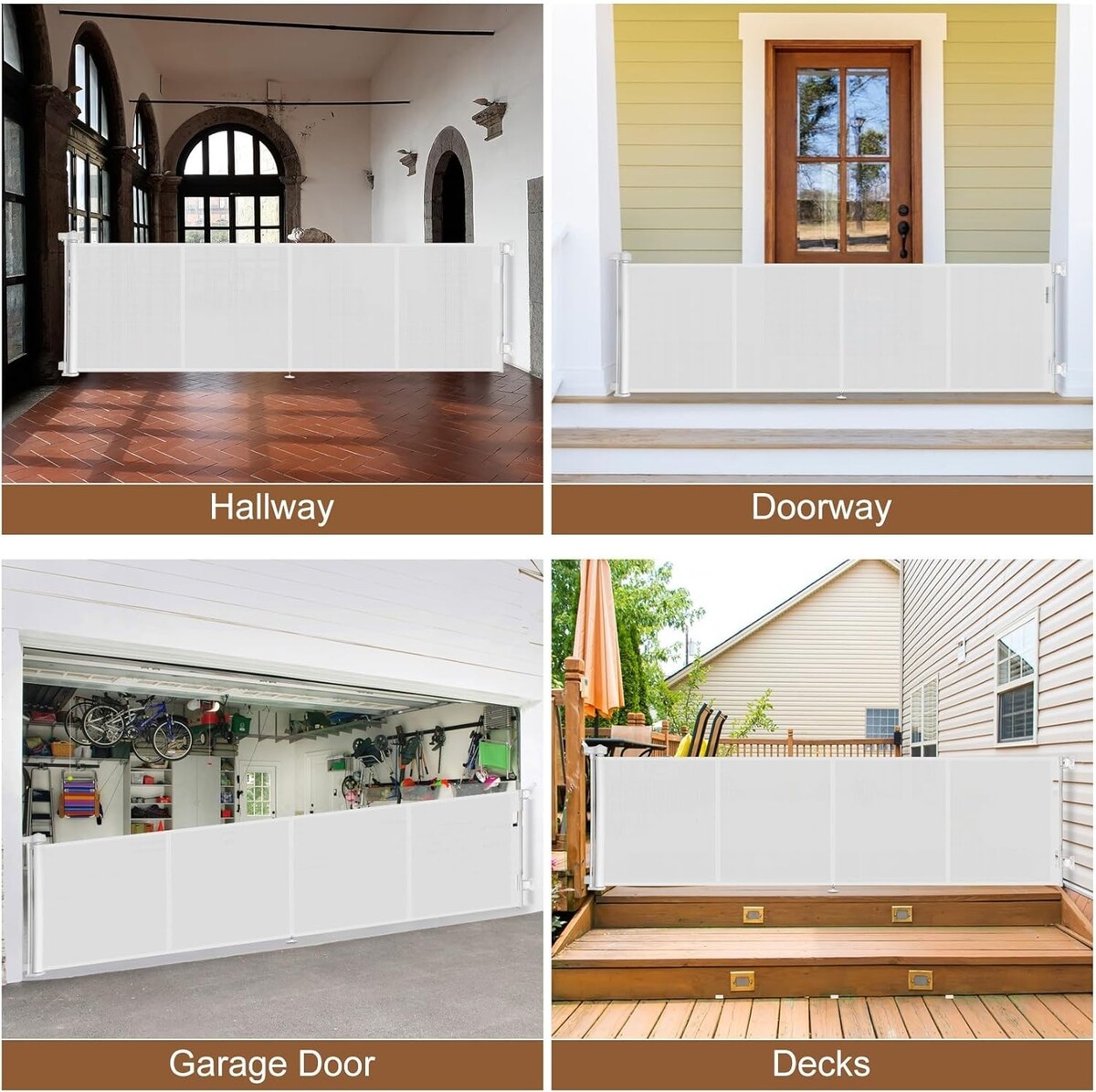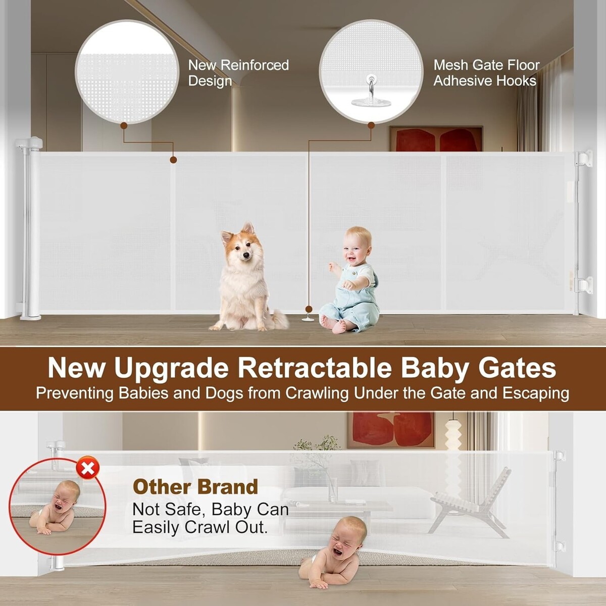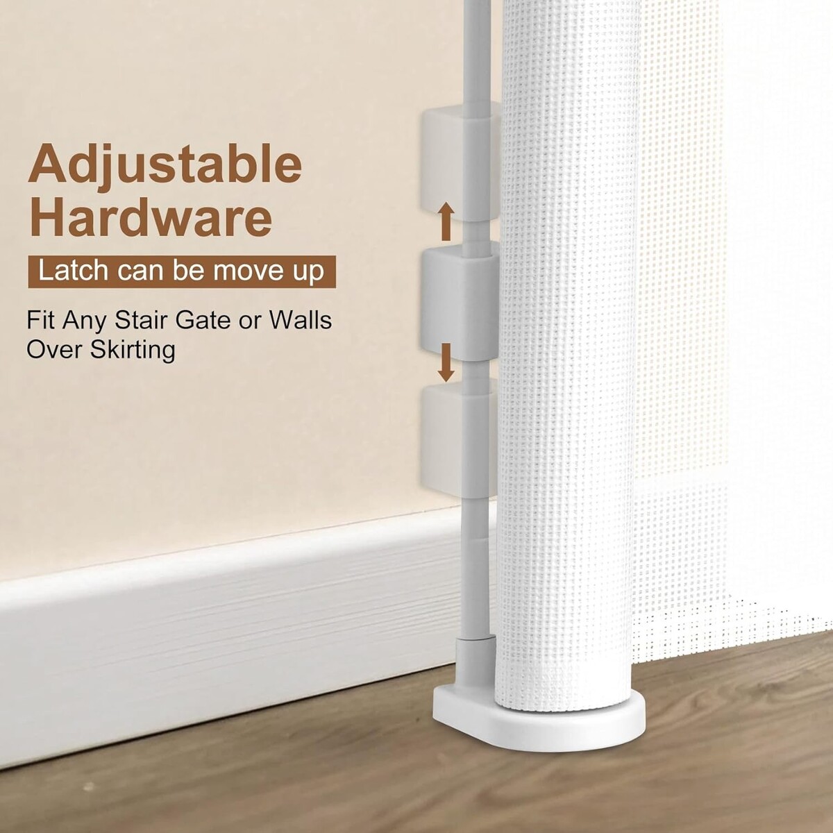 ?Upgraded Retractable Gates?Miumoon retractable baby gates features an innovative fiber bar design that enhances stability, preventing top and bottom mesh deformation. This eliminates the risk of children or pets crawling or squeezing through the gate. The fiber rod design ensures an exceptionally smooth retraction experience.