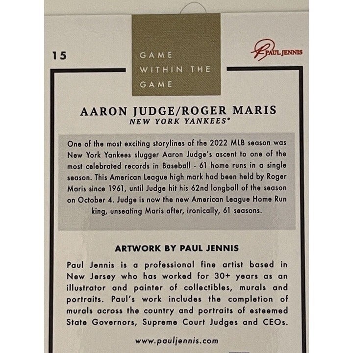 ALL RISE! This 2022 Topps NOW Game Within Game #15 features Aaron Judge and Roger Maris of the New York Yankees. The limited edition card is a must-have for any baseball fan, with its stunning design and high-quality printing. The 35 Pt. card thickness adds to its durability, ensuring that it will remain in near mint or better condition for years to come.