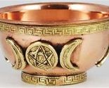 This fantastic offering bowl has been sculpted of copper, leaving it with a beautiful red-gold finish both on its interior and exterior. This natural coloring is further amplified by the brass accents with which it is decorated, depicting ornamental scroll work encircling the rim and the base of the bowl, and the beautifully sculpted Triple Moon Goddess with Pentagram symbols that run along the exterior of the bowl.