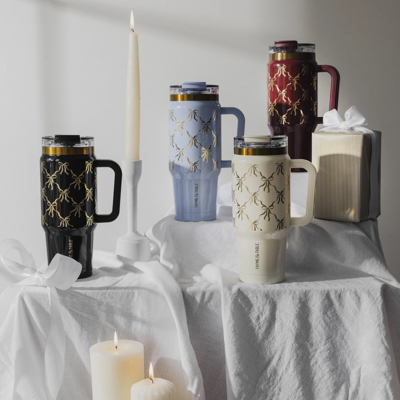 Thyme Table 32 fl oz Stainless Steel Luna Tumbler with Handle and Dual Straw Lid, Red Bow 32 oz Capacity: Perfect for all-day hydration, holding plenty of your favorite drinks. Temperature Control: Keeps liquids cold for 18 hours and hot for 8 hours. Leak-Proof Lid: Features a 2-in-1 design with a flip lid and flip-up straw. Durable Design: Made from double-wall stainless steel for long-lasting use. Fits in Most Cup Holders: Convenient size for commuting, road trips, and more. Easy to Carry: Comes with a sturdy handle for comfortable transportation. Condensation-Free: No sweat on the outside, keeping hands and surfaces dry.
