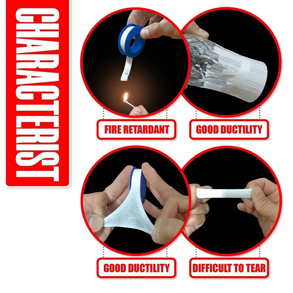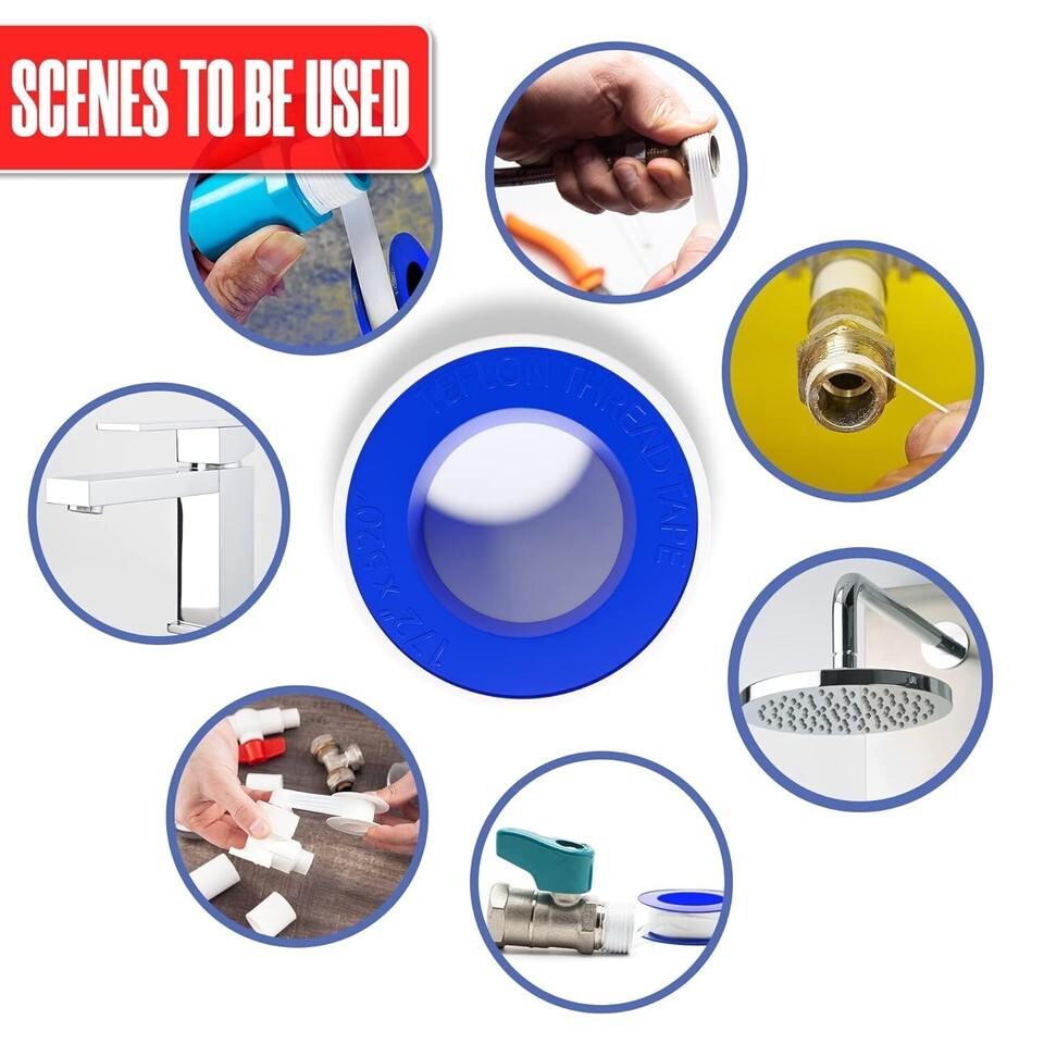 About this item ? SIZE: Each roll of teflon tape has a width of 1/2 inch and a length of 520 inches, which can be used multiple times. ? HEAVY DUTY USE: Made of PTFE material, our thread sealant has high sealing and durability. Teflon tape has a sealing function to prevent the leakage of water or air. ? SAY GOODBYE TO LEAKS - Fix your plumbing issues with our plumbing tape rolls and get a water-tight connection between pipes and prevents unwanted leaks. ? ALL PURPOSE: Tephlon tape is widely used in home and office and it is a necessity for plumbers. Our sealant tape is great for a wide range of pipework and plumbing jobs. Use them for sealing off valves, dripping taps and leaky faucets. ? EASY TO APPLY: Just wrap the leak proof seal tape around any thread to create a leak proof seal. 1. Wrap the tape in clockwise direction around the pipe. 2. Run the tape three or four times over the threads. 3. Break off the tap by pulling and smooth the end with your finger. No waiting for drying or curing. It goes on smooth without hardening or cracking.