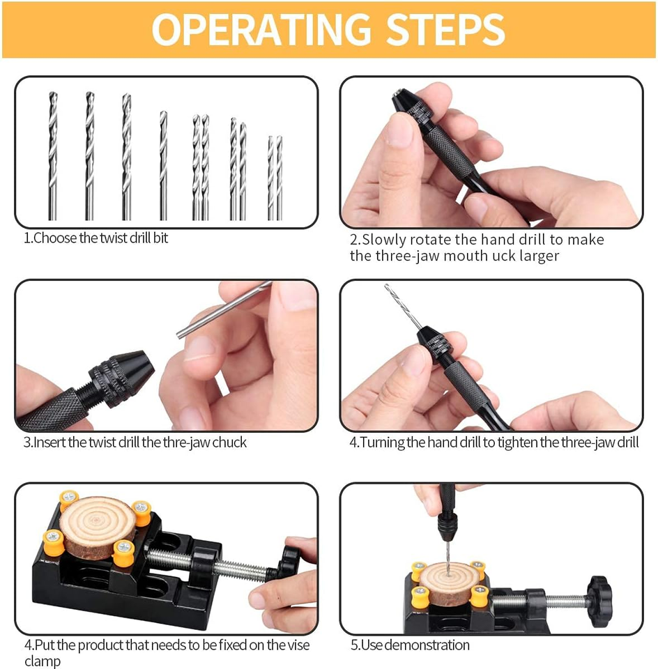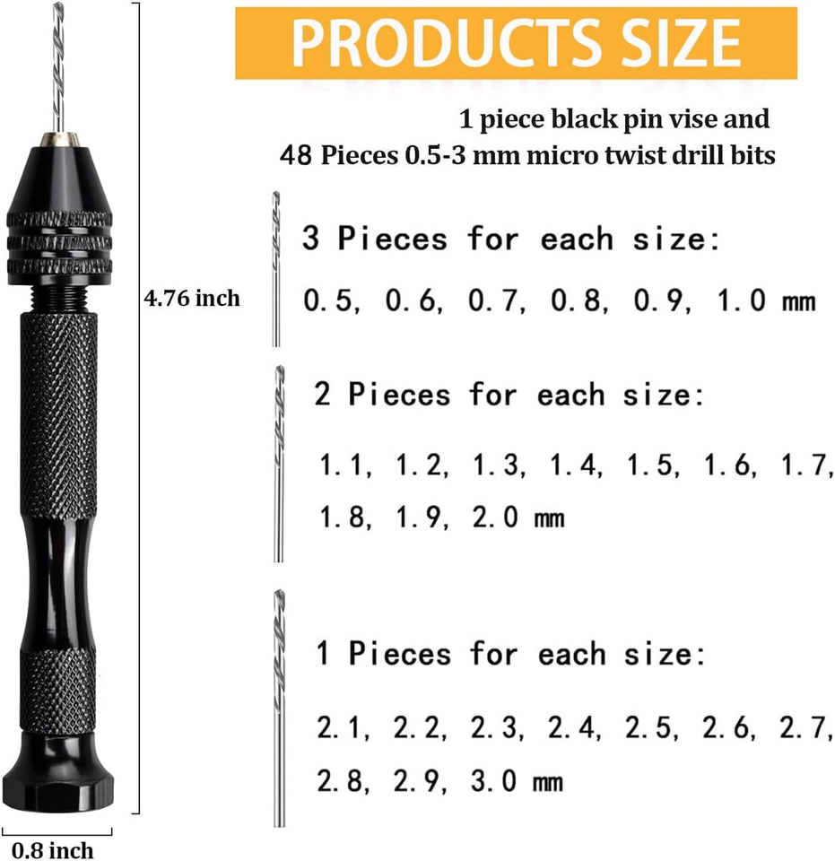 ?User-Friendly Design?The included hand pin vise is constructed from high-quality aluminum alloy and features a 3-claw chuck with a clamping range of 0.3-3.4mm, allowing for easy and secure bit adjustments. The rotatable tail enhances usability, making it convenient for prolonged use in detailed work. Whether you are a seasoned craftsman or a beginner, this set provides the tools you need to achieve professional results.