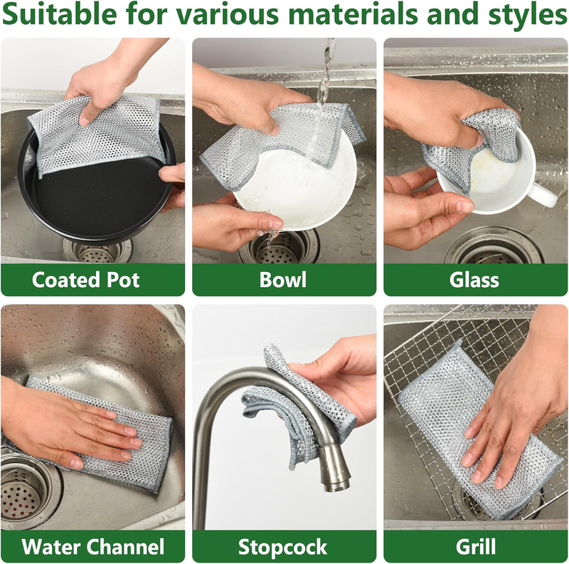 ?Double-layer?Our wire dishwashing cloth features a Double-layer design, with crafted from soft Non-Scratch mesh fiber side. Our wire dish rags perfect for wiping down cookware surfaces, spotless finish after washing your kitchenware.