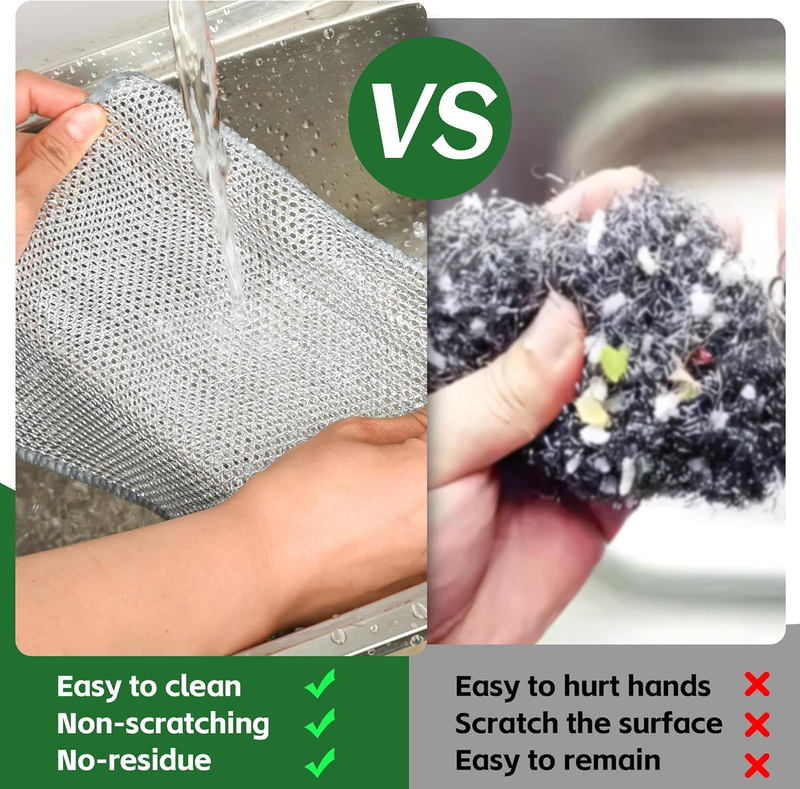 ?Non Scratch and Soft?Wire mesh Double-layer designed, won't hurt your hands, the fine holes can not only allow cleaning liquid to penetrate better. Clean faster than traditional kitchen dishcloth. Without scratching delicate utensils like glass, ceramic dishes, or non-stick cookware.