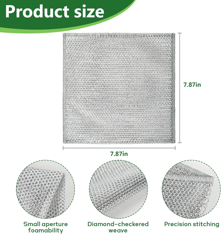 Made from high-quality fabric and silver wire mesh, these wire dishwashing rags are durable and long-lasting. They measure 7.87x7.87 inches and can be used repeatedly without losing their effectiveness.