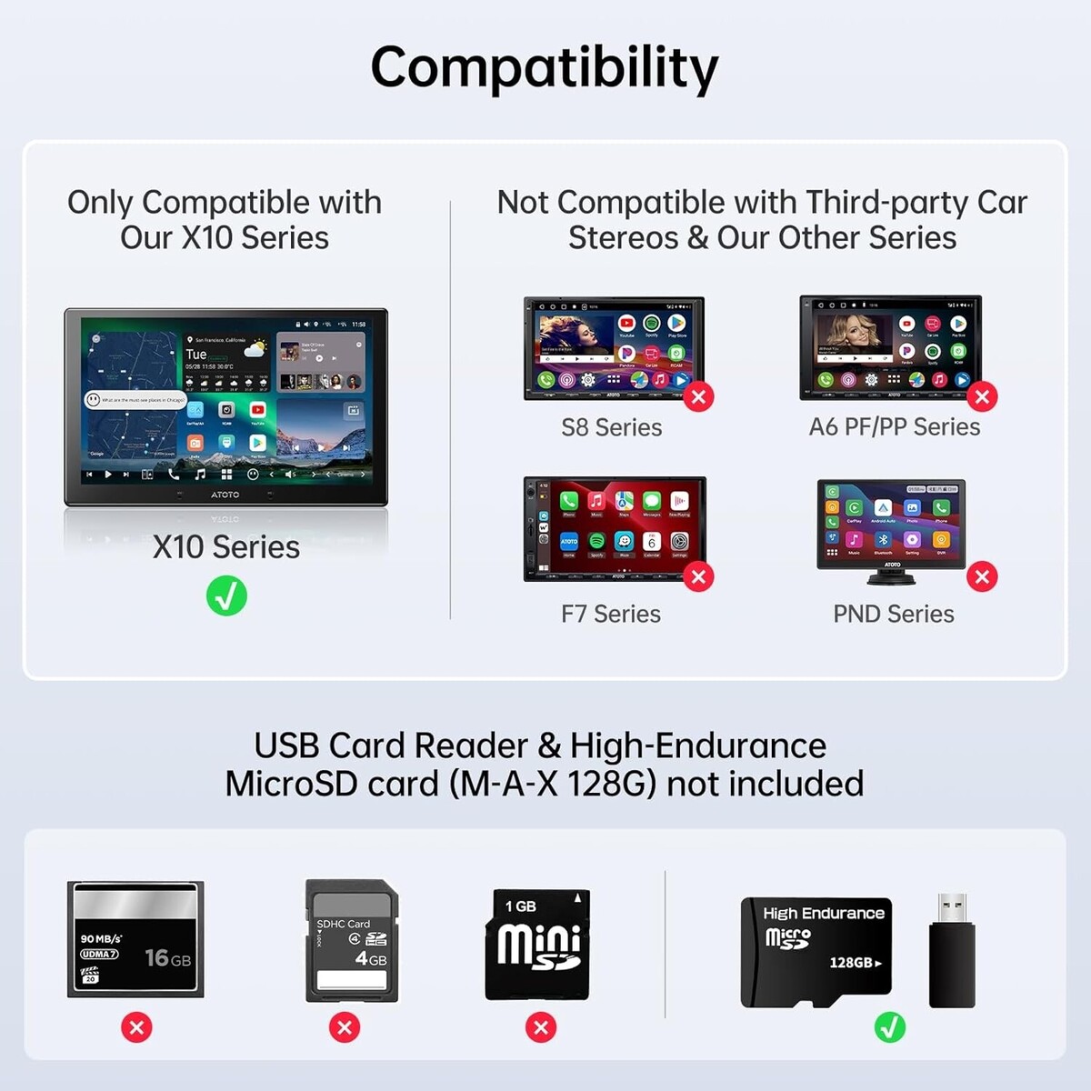 Compatibility Notice: Compatible only with X10 series; not compatible with S8, A5,A6 PF/PP, F7, PND series, or third-party car stereos