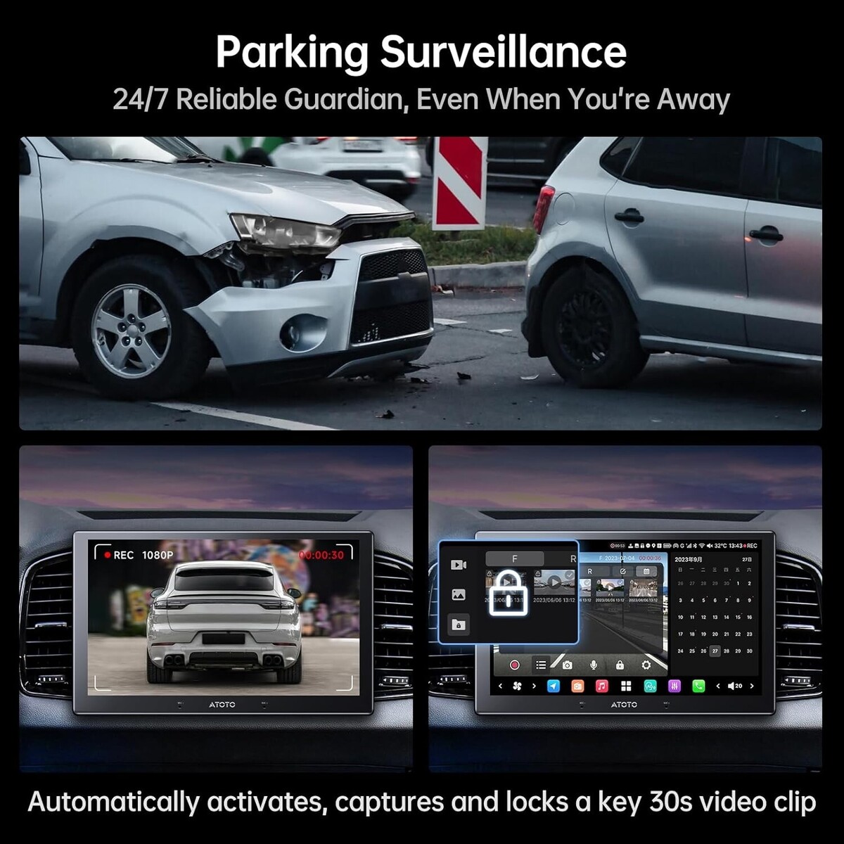 Parking Surveillance G-Sensor: Auto activates upon collision detection when parked; captures and locks a 30-second video clip for evidence; G-sensor detects collisions while driving and locks footage