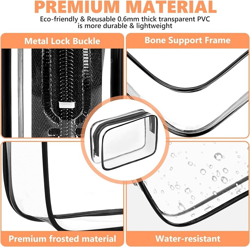 ????Improved zipper Waterproof?Improved zipper head makes it smoother. Clear toiletries pouch prevents your small bottles and water from messing up your entire luggage if they happen to leak. Waterproof PVC material makes it easier to clean, durable and scratch-resistant, and any stains on it can be easily wiped off with a towel.