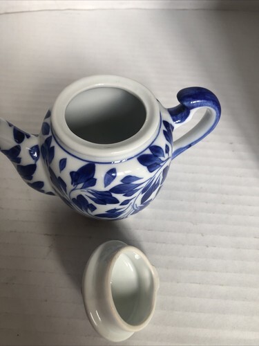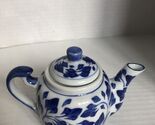 Andrea by Sadek Miniature Teapot Porcelain White with Blue Leaf Design. Condition is Used. Shipped with USPS Ground Advantage.