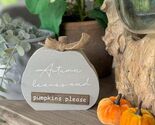 Autumnal Grey ?Autumn Leaves and Pumpkins Please? Pumpkin Sign. Freestanding This fabulous wooden block shaped like a pumpkin features the quote 'Autumn Leaves and Pumpkins Please'. Finished with a wooden stem and topped off with a twine bow. Measures W12.7 x H12 x D2.3cm Sending as a gift? Select Gift at checkout and add your personal message. Gifts are sent without priced invoices.