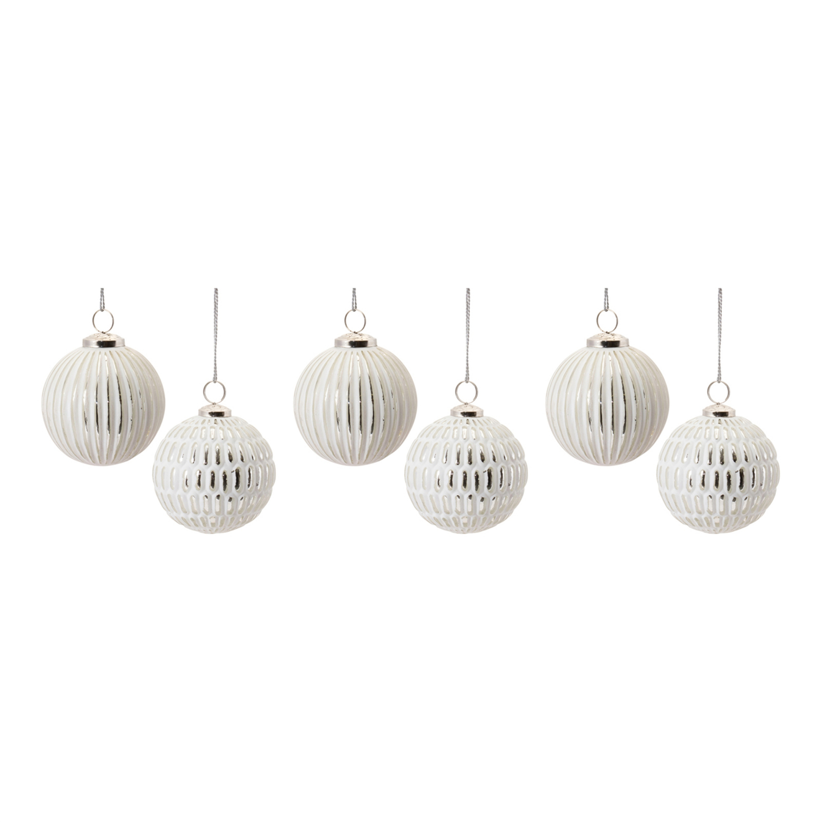 Adorn your Christmas tree and holiday decor with this stunning set of Frosted Glass Ball Ornaments. Featuring 6 pieces, the wintry white and chic silver tones paired with the frosted design is the perfect combination to create a memorable display. The quality glass composition and delicate silver string hanging accent is sure to endure for seasons to come. Whether you re adding a touch of cheer to your home or gifting to a loved one, these ornaments will definitely bring smiles.
