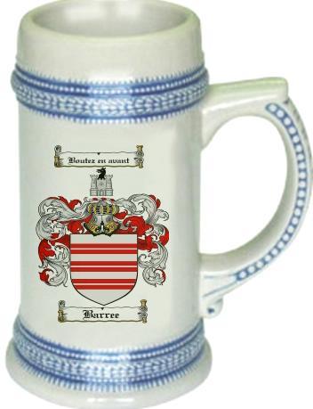 Barree Family Crest Stein / Coat of Arms Beer Tankard. We believe our Coat of Arms Steins are of the highest quality anywhere. The glassware quality is very thick and sturdy. The stein feels great in your hand with a very thick handle. Fill this glass with your favorite beer or beverage. keywords: steins, beer, german, glass, glassware, cup, tankard, goblet, family shields, shield, family, genealogy, heraldry, code of arms