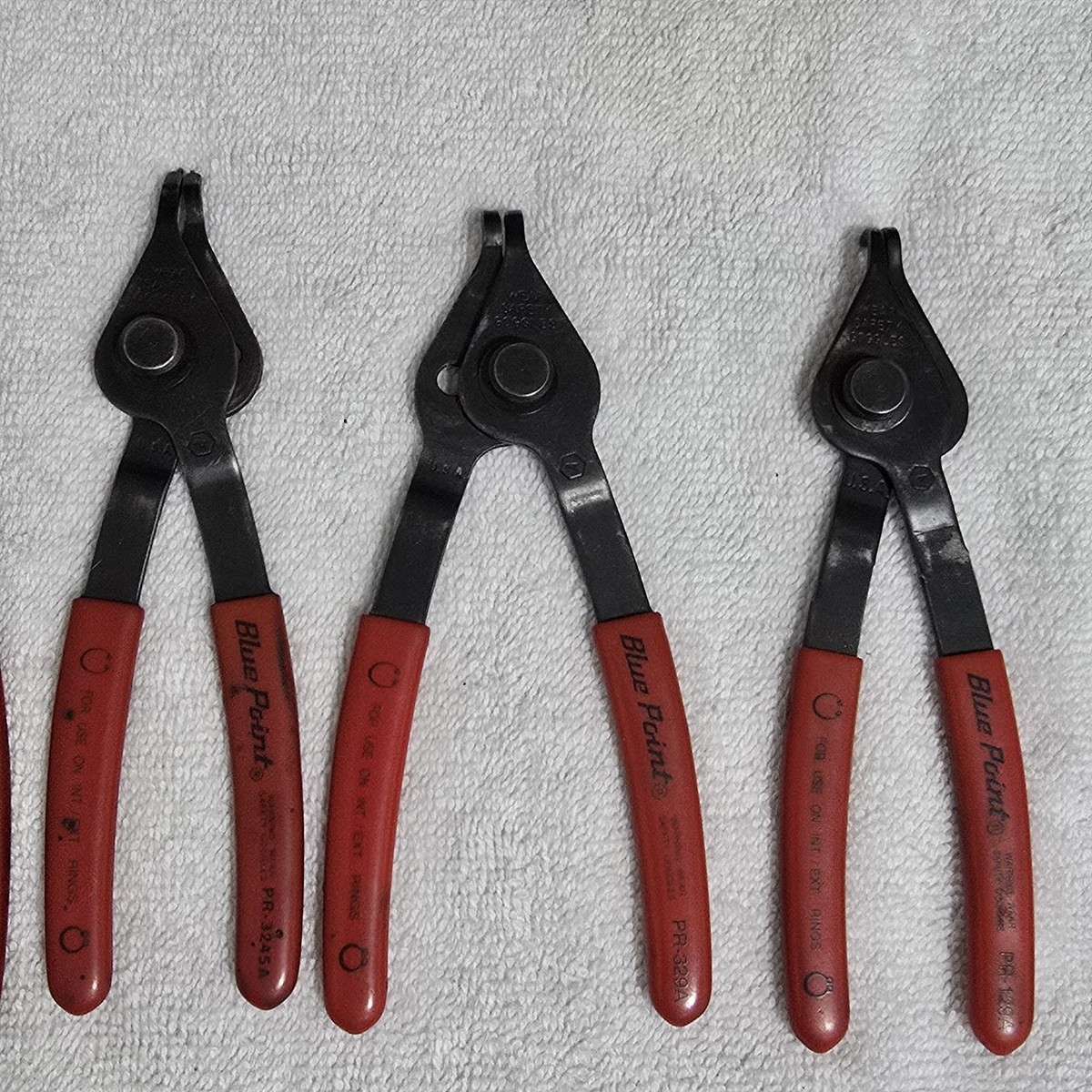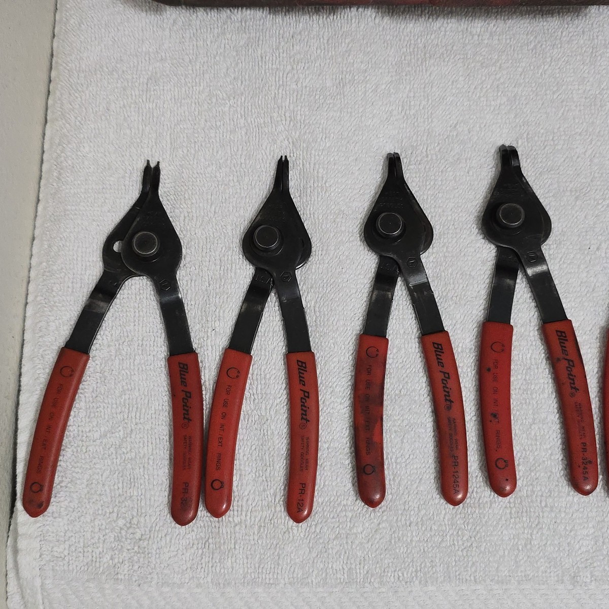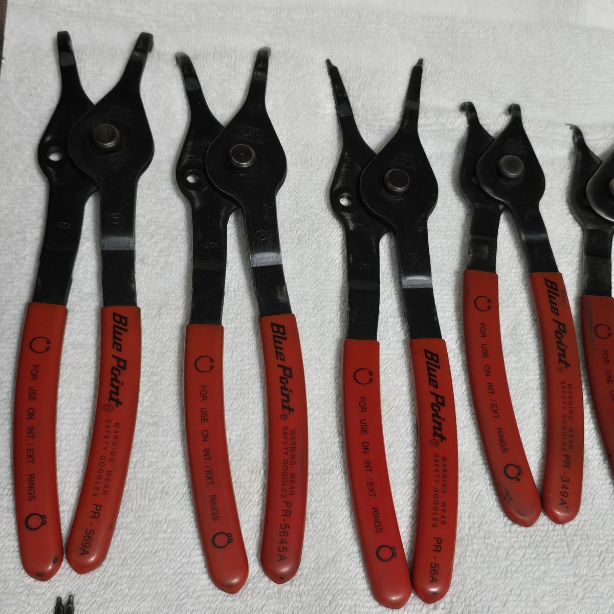 Genuine Blue Point 12-piece PR Series snap ring pliers set Includes models: ? PR12A ? PR1245A ? PR129A ? PR27 ? PR32A ? PR3245A ? PR329A ? PR34A ? PR349A ? PR56A ? PR5645A ? PR569A Convertible for both internal and external snap rings Made in USA by Snap-on Red vinyl-coated handles Original molded red plastic case included (extremely dirty) Excellent variety of tip angles and sizes for professional applications ***Case is extremely dirty with old mostly old dried-on oil and grime. The pliers themselves have definitely been used and are dirty, but the majority of the grime has been wiped off, so handling them won?t get your hands too dirty. Comes exactly as pictured. Please see photos.*** SMOKE FREE HOME! SUPER FAST SHIPPING! #2