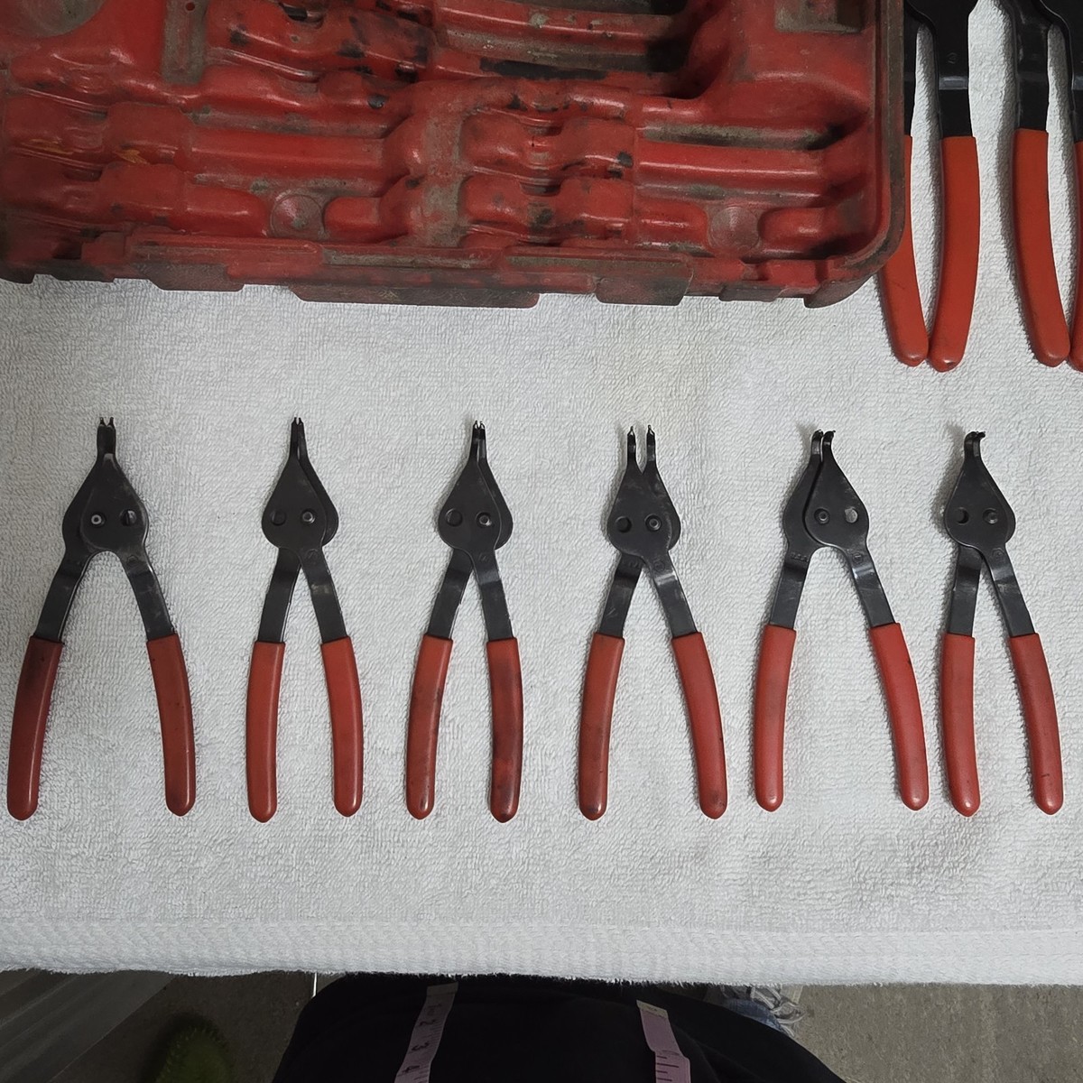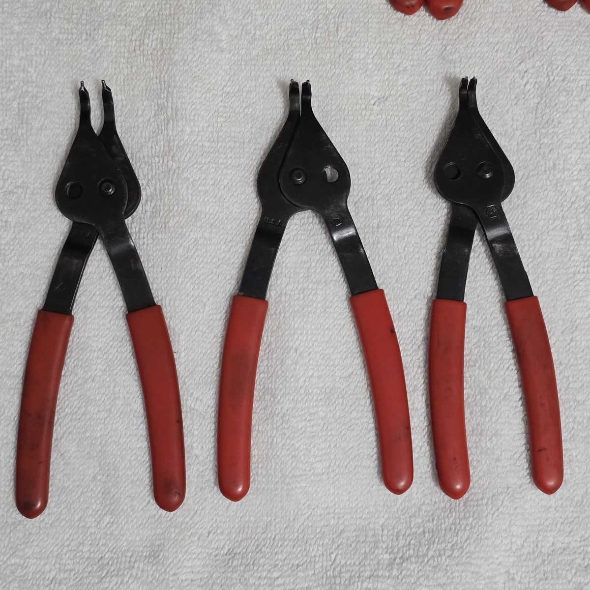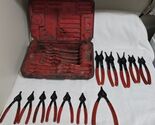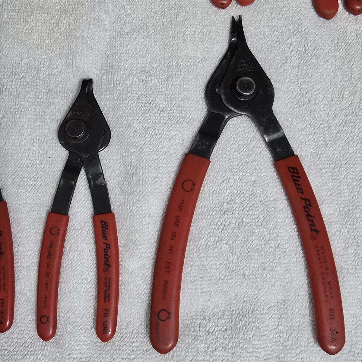 Genuine Blue Point 12-piece PR Series snap ring pliers set Includes models: ? PR12A ? PR1245A ? PR129A ? PR27 ? PR32A ? PR3245A ? PR329A ? PR34A ? PR349A ? PR56A ? PR5645A ? PR569A Convertible for both internal and external snap rings Made in USA by Snap-on Red vinyl-coated handles Original molded red plastic case included (extremely dirty) Excellent variety of tip angles and sizes for professional applications ***Case is extremely dirty with old mostly old dried-on oil and grime. The pliers themselves have definitely been used and are dirty, but the majority of the grime has been wiped off, so handling them won?t get your hands too dirty. Comes exactly as pictured. Please see photos.*** SMOKE FREE HOME! SUPER FAST SHIPPING! #2