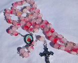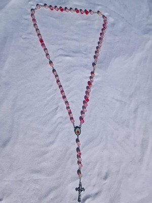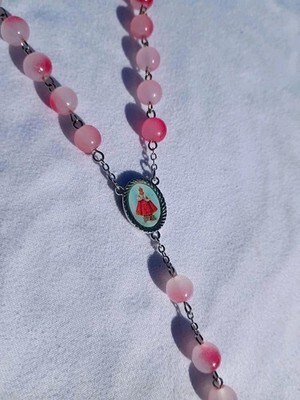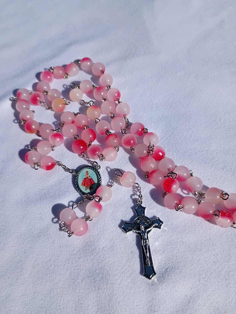 This tender rosary features soft pink frosted glass beads, each bead touched with natural blush tones that give it a warm, graceful glow. The centerpiece honors the Infant Jesus of Prague, symbolizing trust, miracles, and divine protection. A silver-tone crucifix completes this serene and uplifting devotional piece.